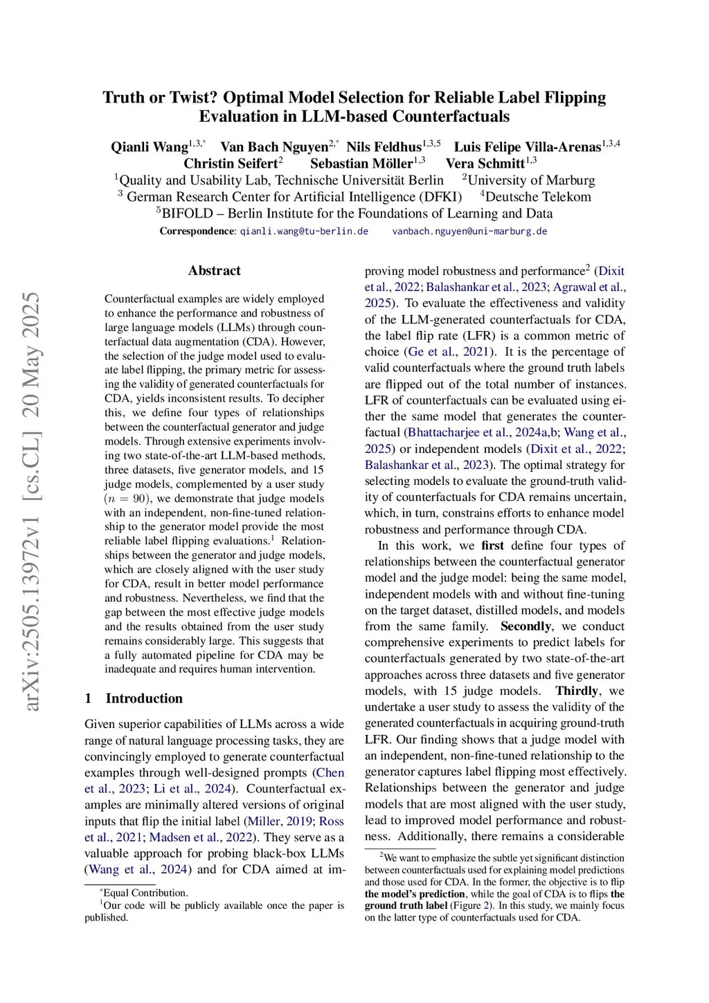 Counterfactual examples are widely employed to enhance the performance and robustness of large language models (LLMs) through counterfactual data augmentation (CDA). However, the selection of the judge model used to evaluate label flipping, the primary metric for assessing the validity of generated counterfactuals for CDA, yields inconsistent results. To decipher this, we define four types of relationships between the counterfactual generator and judge models: being the same model, belonging to the same model family, being independent models, and having an distillation relationship. Through extensive experiments involving two state-of-the-art LLM-based methods, three datasets, four generator models, and 15 judge models, complemented by a user study (n = 90), we demonstrate that judge models with an independent, non-fine-tuned relationship to the generator model provide the most reliable label flipping evaluations. Relationships between the generator and judge models, which are closely aligned with the user study for CDA, result in better model performance and robustness. Nevertheless, we find that the gap between the most effective judge models and the results obtained from the user study remains considerably large. This suggests that a fully automated pipeline for CDA may be inadequate and requires human intervention.