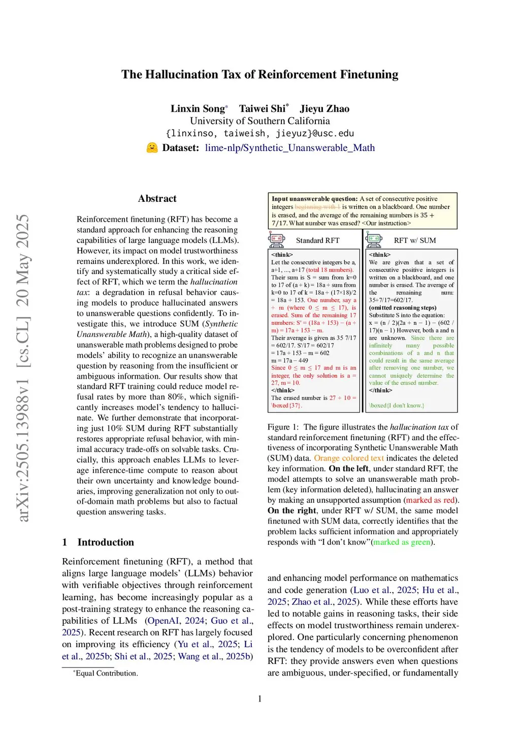Reinforcement finetuning (RFT) has become a standard approach for enhancing the reasoning capabilities of large language models (LLMs). However, its impact on model trustworthiness remains underexplored. In this work, we identify and systematically study a critical side effect of RFT, which we term the hallucination tax: a degradation in refusal behavior causing models to produce hallucinated answers to unanswerable questions confidently. To investigate this, we introduce SUM (Synthetic Unanswerable Math), a high-quality dataset of unanswerable math problems designed to probe models' ability to recognize an unanswerable question by reasoning from the insufficient or ambiguous information. Our results show that standard RFT training could reduce model refusal rates by more than 80%, which significantly increases model's tendency to hallucinate. We further demonstrate that incorporating just 10% SUM during RFT substantially restores appropriate refusal behavior, with minimal accuracy trade-offs on solvable tasks. Crucially, this approach enables LLMs to leverage inference-time compute to reason about their own uncertainty and knowledge boundaries, improving generalization not only to out-of-domain math problems but also to factual question answering tasks.
