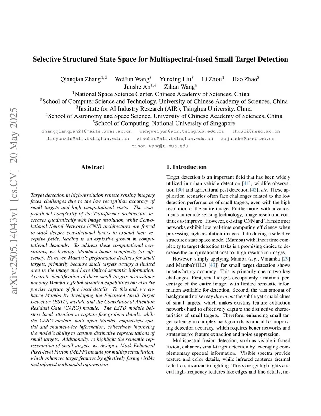 Target detection in high-resolution remote sensing imagery faces challenges due to the low recognition accuracy of small targets and high computational costs. The computational complexity of the Transformer architecture increases quadratically with image resolution, while Convolutional Neural Networks (CNN) architectures are forced to stack deeper convolutional layers to expand their receptive fields, leading to an explosive growth in computational demands. To address these computational constraints, we leverage Mamba's linear complexity for efficiency. However, Mamba's performance declines for small targets, primarily because small targets occupy a limited area in the image and have limited semantic information. Accurate identification of these small targets necessitates not only Mamba's global attention capabilities but also the precise capture of fine local details. To this end, we enhance Mamba by developing the Enhanced Small Target Detection (ESTD) module and the Convolutional Attention Residual Gate (CARG) module. The ESTD module bolsters local attention to capture fine-grained details, while the CARG module, built upon Mamba, emphasizes spatial and channel-wise information, collectively improving the model's ability to capture distinctive representations of small targets. Additionally, to highlight the semantic representation of small targets, we design a Mask Enhanced Pixel-level Fusion (MEPF) module for multispectral fusion, which enhances target features by effectively fusing visible and infrared multimodal information.
