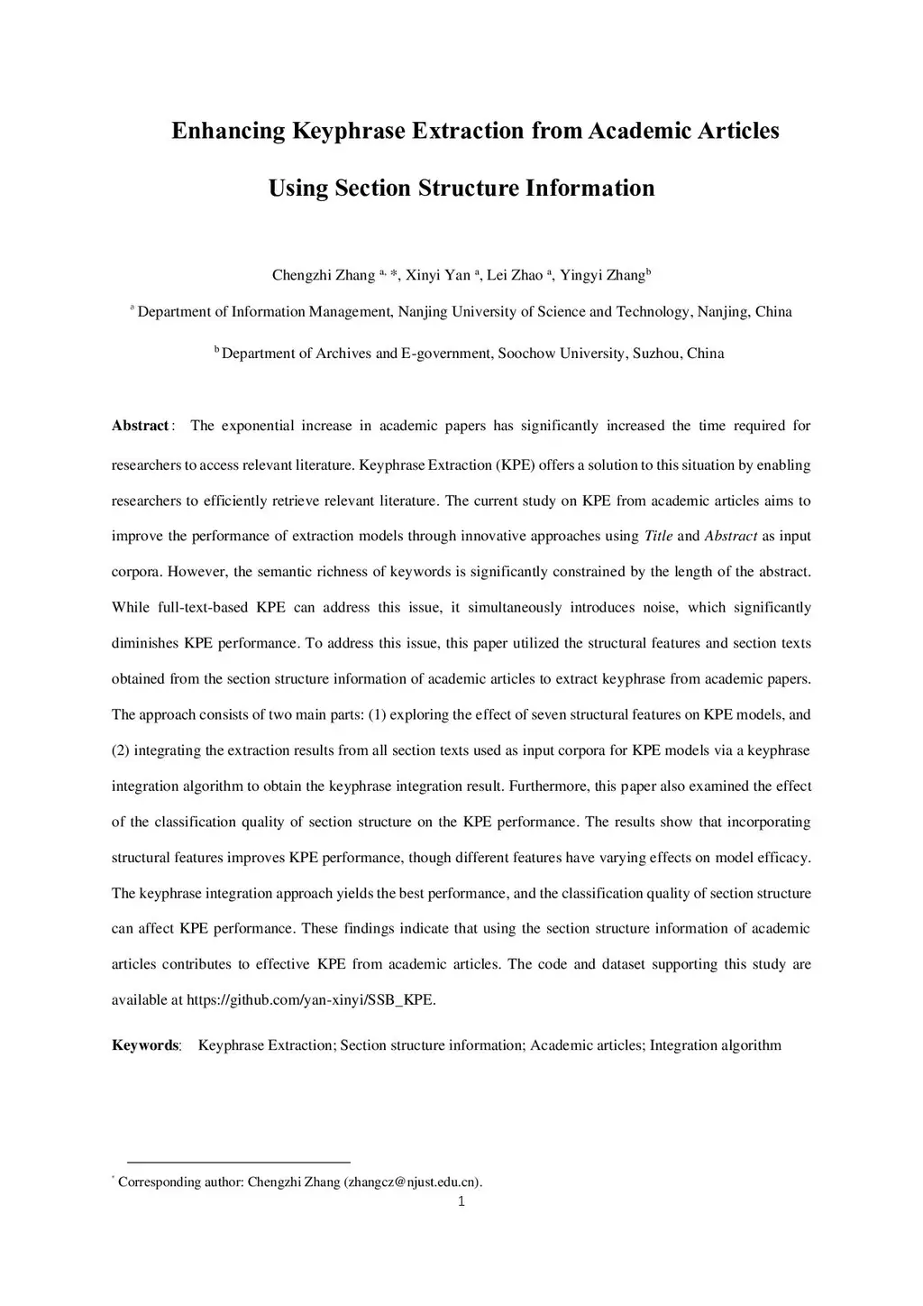 Enhancing Keyphrase Extraction from Academic Articles Using Section Structure Information