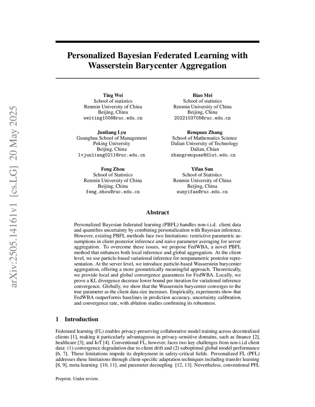 Personalized Bayesian federated learning (PBFL) handles non-i.i.d. client data and quantifies uncertainty by combining personalization with Bayesian inference. However, existing PBFL methods face two limitations: restrictive parametric assumptions in client posterior inference and naive parameter averaging for server aggregation. To overcome these issues, we propose FedWBA, a novel PBFL method that enhances both local inference and global aggregation. At the client level, we use particle-based variational inference for nonparametric posterior representation. At the server level, we introduce particle-based Wasserstein barycenter aggregation, offering a more geometrically meaningful approach. Theoretically, we provide local and global convergence guarantees for FedWBA. Locally, we prove a KL divergence decrease lower bound per iteration for variational inference convergence. Globally, we show that the Wasserstein barycenter converges to the true parameter as the client data size increases. Empirically, experiments show that FedWBA outperforms baselines in prediction accuracy, uncertainty calibration, and convergence rate, with ablation studies confirming its robustness.