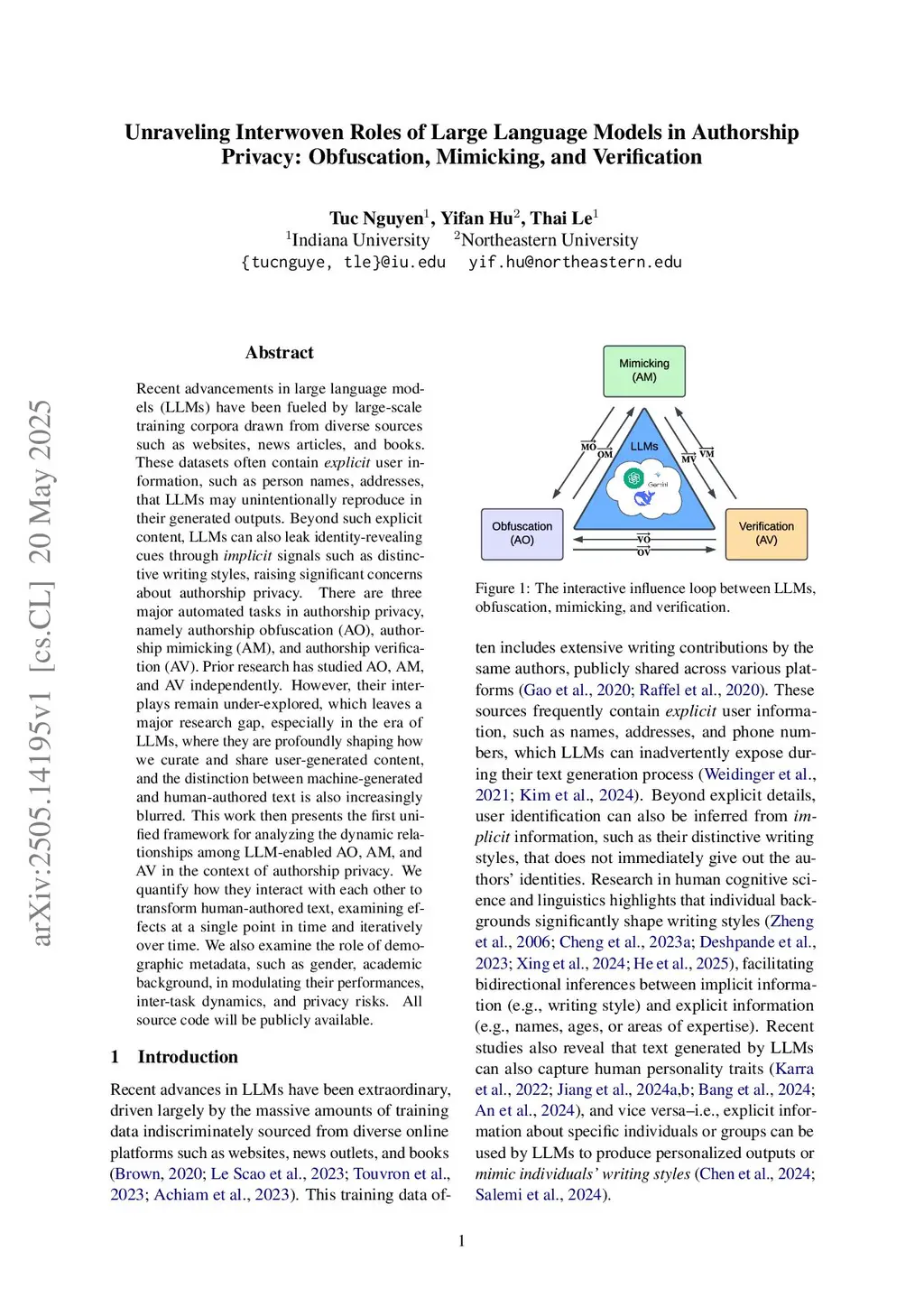 Recent advancements in large language models (LLMs) have been fueled by large scale training corpora drawn from diverse sources such as websites, news articles, and books. These datasets often contain explicit user information, such as person names and addresses, that LLMs may unintentionally reproduce in their generated outputs. Beyond such explicit content, LLMs can also leak identity revealing cues through implicit signals such as distinctive writing styles, raising significant concerns about authorship privacy. There are three major automated tasks in authorship privacy, namely authorship obfuscation (AO), authorship mimicking (AM), and authorship verification (AV). Prior research has studied AO, AM, and AV independently. However, their interplays remain under explored, which leaves a major research gap, especially in the era of LLMs, where they are profoundly shaping how we curate and share user generated content, and the distinction between machine generated and human authored text is also increasingly blurred. This work then presents the first unified framework for analyzing the dynamic relationships among LLM enabled AO, AM, and AV in the context of authorship privacy. We quantify how they interact with each other to transform human authored text, examining effects at a single point in time and iteratively over time. We also examine the role of demographic metadata, such as gender, academic background, in modulating their performances, inter-task dynamics, and privacy risks. All source code will be publicly available.