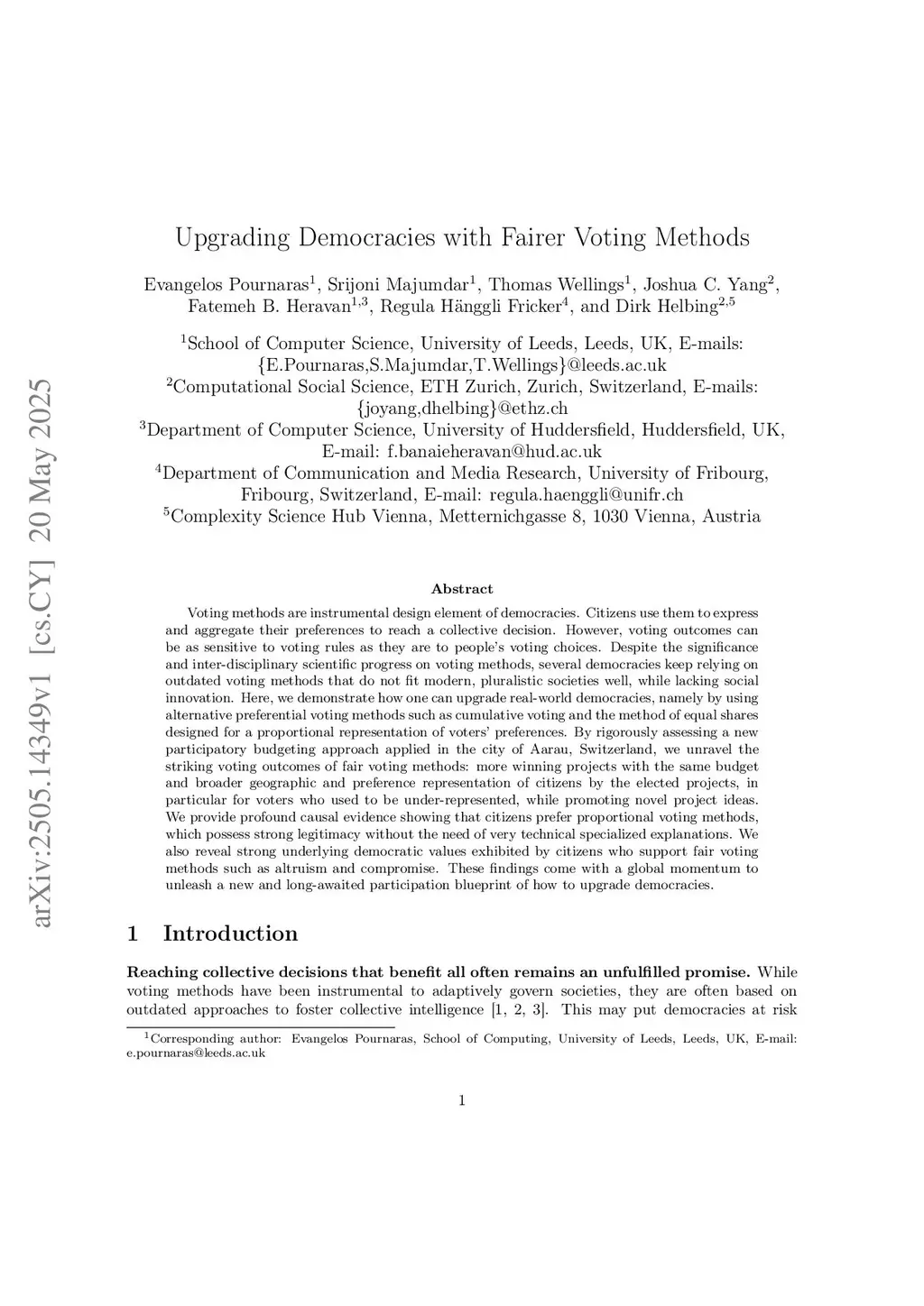 Voting methods are instrumental design elements of democracies. Citizens use them to express and aggregate their preferences to reach a collective decision. However, voting outcomes can be as sensitive to voting rules as they are to people's voting choices. Despite significance and interdisciplinary scientific progress, several democracies keep relying on outdated voting methods that do not fit modern, pluralistic societies well, while lacking social innovation. Here, we demonstrate how one can upgrade real-world democracies, namely by using alternative preferential voting methods such as cumulative voting and the method of equal shares designed for a proportional representation of voters' preferences. We rigorously evaluate the striking voting outcomes of these fair voting methods in a new participatory budgeting approach applied in the city of Aarau, Switzerland, including past and follow-up evidence. Results show more winning projects with the same budget. They also show broader geographic and preference representation of citizens by the elected projects, in particular for voters who used to be under-represented. We provide causal evidence showing that citizens prefer proportional voting methods, which possess strong legitimacy without the need of very specialized technical explanations. We also reveal strong underlying democratic values exhibited by citizens who support fair voting methods such as altruism and compromise. These findings come with the momentum to unleash a new and long-awaited participation blueprint of how to upgrade democracies globally.