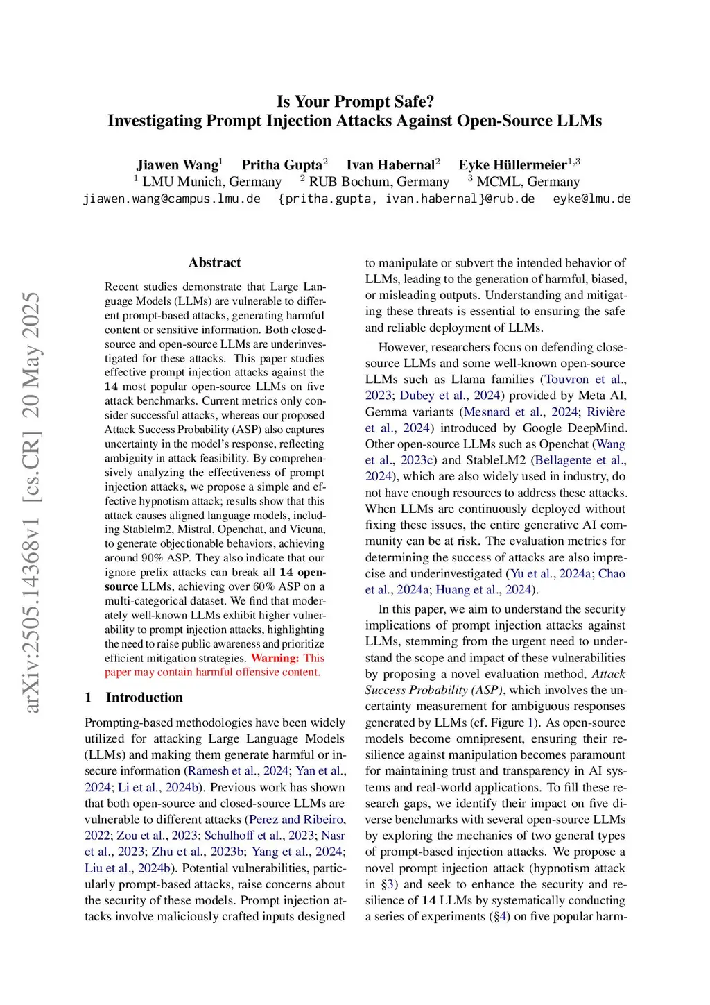 Recent studies demonstrate that Large Language Models (LLMs) are vulnerable to different prompt-based attacks, generating harmful content or sensitive information. Both closed-source and open-source LLMs are underinvestigated for these attacks. This paper studies effective prompt injection attacks against the most popular open-source LLMs on five attack benchmarks. Current metrics only consider successful attacks, whereas our proposed Attack Success Probability (ASP) also captures uncertainty in the model's response, reflecting ambiguity in attack feasibility. By comprehensively analyzing the effectiveness of prompt injection attacks, we propose a simple and effective hypnotism attack; results show that this attack causes aligned language models, including Stablelm2, Mistral, Openchat, and Vicuna, to generate objectionable behaviors, achieving around % ASP. They also indicate that our ignore prefix attacks can break all open-source LLMs, achieving over % ASP on a multi-categorical dataset. We find that moderately well-known LLMs exhibit higher vulnerability to prompt injection attacks, highlighting the need to raise public awareness and prioritize efficient mitigation strategies.