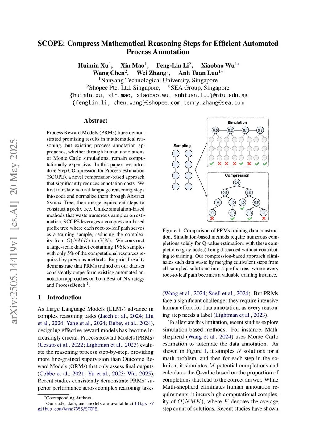 Process Reward Models (PRMs) have demonstrated promising results in mathematical reasoning, but existing process annotation approaches, whether through human annotations or Monte Carlo simulations, remain computationally expensive. In this paper, we introduce Step COmpression for Process Estimation (SCOPE), a novel compression-based approach that significantly reduces annotation costs. We first translate natural language reasoning steps into code and normalize them through Abstract Syntax Tree, then merge equivalent steps to construct a prefix tree. Unlike simulation-based methods that waste numerous samples on estimation, SCOPE leverages a compression-based prefix tree where each root-to-leaf path serves as a training sample, reducing the complexity from to . We construct a large-scale dataset containing 196K samples with only 5% of the computational resources required by previous methods. Empirical results demonstrate that PRMs trained on our dataset consistently outperform existing automated annotation approaches on both Best-of-N strategy and ProcessBench.