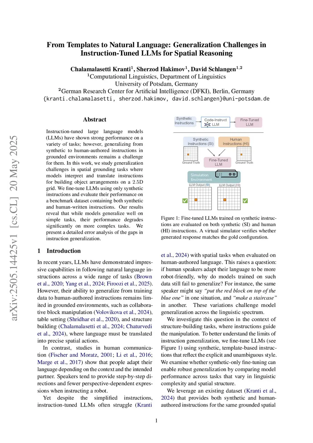 Instruction-tuned large language models (LLMs) have shown strong performance on a variety of tasks; however, generalizing from synthetic to human-authored instructions in grounded environments remains a challenge for them. In this work, we study generalization challenges in spatial grounding tasks where models interpret and translate instructions for building object arrangements on a D grid. We fine-tune LLMs using only synthetic instructions and evaluate their performance on a benchmark dataset containing both synthetic and human-written instructions. Our results reveal that while models generalize well on simple tasks, their performance degrades significantly on more complex tasks. We present a detailed error analysis of the gaps in instruction generalization.