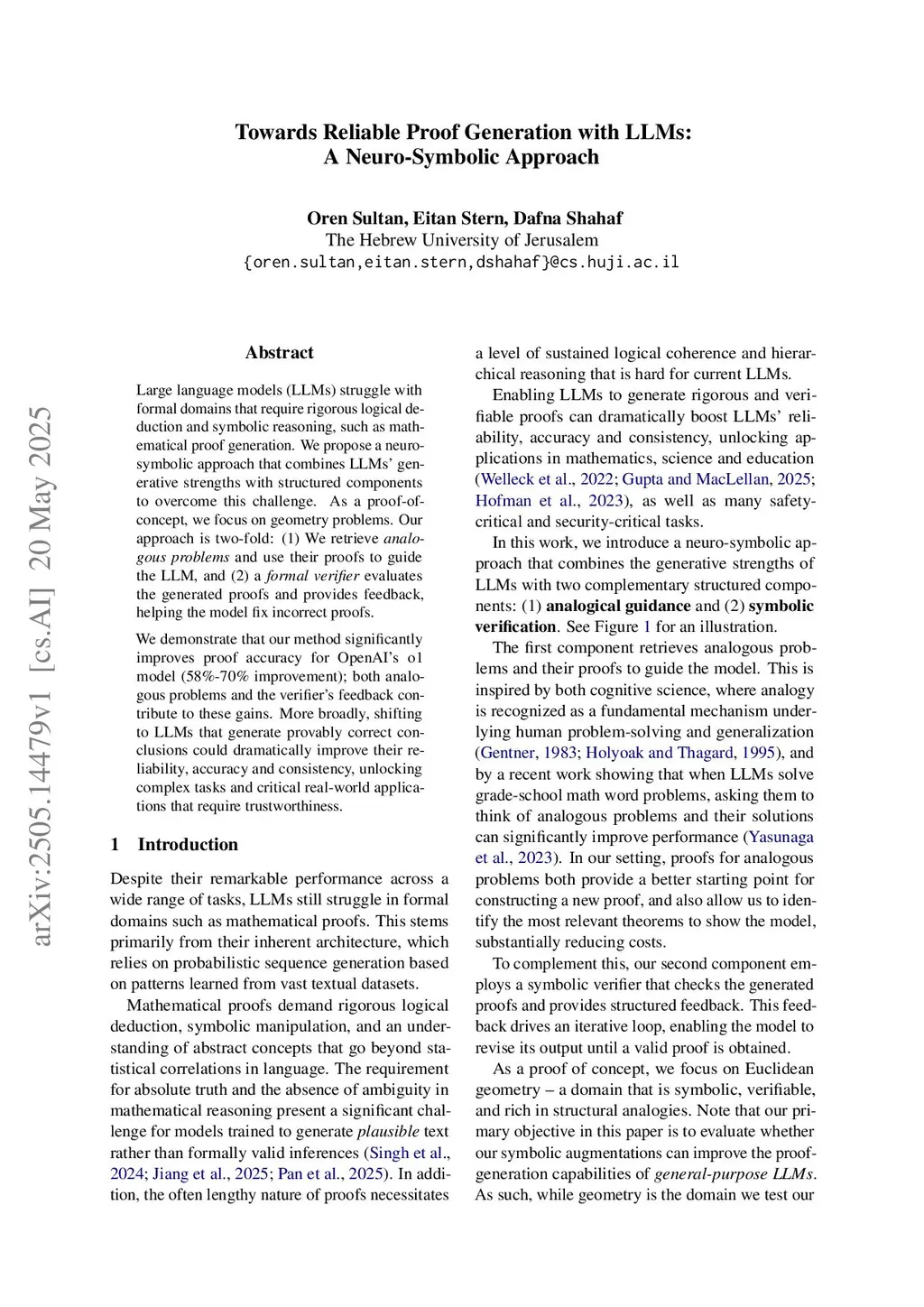 Large language models (LLMs) struggle with formal domains that require rigorous logical deduction and symbolic reasoning, such as mathematical proof generation. We propose a neuro-symbolic approach that combines LLMs' generative strengths with structured components to overcome this challenge. As a proof-of-concept, we focus on geometry problems. Our approach is two-fold: (1) we retrieve analogous problems and use their proofs to guide the LLM, and (2) a formal verifier evaluates the generated proofs and provides feedback, helping the model fix incorrect proofs. We demonstrate that our method significantly improves proof accuracy for OpenAI's o1 model (58%-70% improvement); both analogous problems and the verifier's feedback contribute to these gains. More broadly, shifting to LLMs that generate provably correct conclusions could dramatically improve their reliability, accuracy and consistency, unlocking complex tasks and critical real-world applications that require trustworthiness.