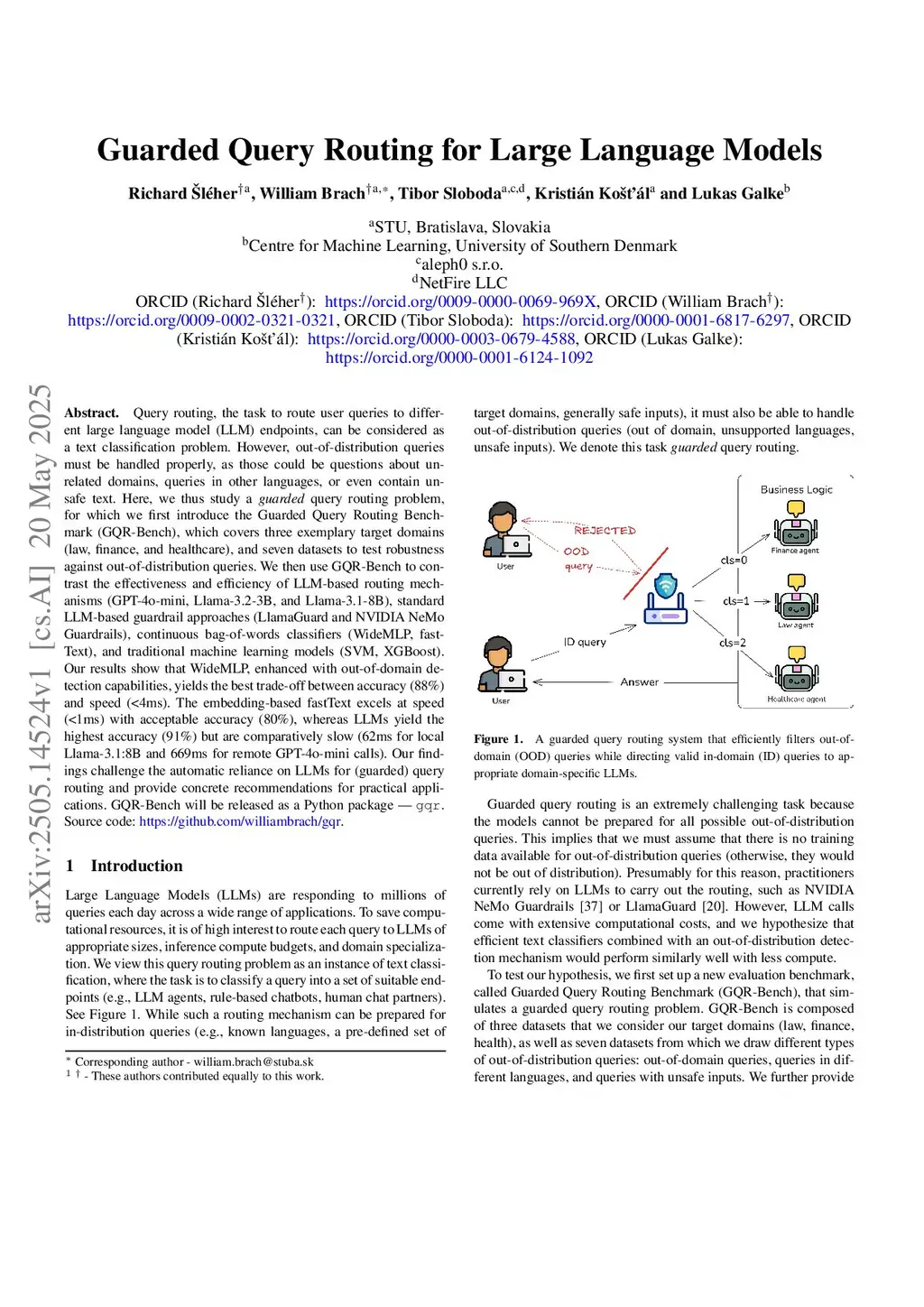 Query routing, the task to route user queries to different large language model (LLM) endpoints, can be considered as a text classification problem. However, out-of-distribution queries must be handled properly, as those could be about unrelated domains, queries in other languages, or even contain unsafe text. Here, we thus study a guarded query routing problem, for which we first introduce the Guarded Query Routing Benchmark (GQR-Bench, released as Python package gqr), covers three exemplary target domains (law, finance, and healthcare), and seven datasets to test robustness against out-of-distribution queries. We then use GQR-Bench to contrast the effectiveness and efficiency of LLM-based routing mechanisms (GPT-4o-mini, Llama-3.2-3B, and Llama-3.1-8B), standard LLM-based guardrail approaches (LlamaGuard and NVIDIA NeMo Guardrails), continuous bag-of-words classifiers (WideMLP, fastText), and traditional machine learning models (SVM, XGBoost). Our results show that WideMLP, enhanced with out-of-domain detection capabilities, yields the best trade-off between accuracy (88%) and speed (<4ms). The embedding-based fastText excels at speed (<1ms) with acceptable accuracy (80%), whereas LLMs yield the highest accuracy (91%) but are comparatively slow (62ms for local Llama-3.1:8B and 669ms for remote GPT-4o-mini calls). Our findings challenge the automatic reliance on LLMs for (guarded) query routing and provide concrete recommendations for practical applications. Source code is available:this https URL.