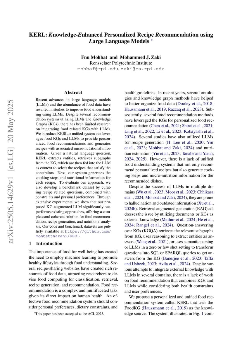 KERL: Knowledge-Enhanced Personalized Recipe Recommendation using Large Language Models