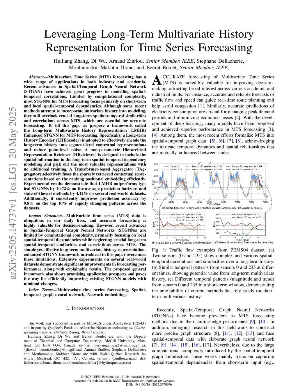 Multivariate Time Series (MTS) forecasting has a wide range of applications in both industry and academia. Recent advances in Spatial-Temporal Graph Neural Network (STGNN) have achieved great progress in modelling spatial-temporal correlations. Limited by computational complexity, most STGNNs for MTS forecasting focus primarily on short-term and local spatial-temporal dependencies. Although some recent methods attempt to incorporate univariate history into modeling, they still overlook crucial long-term spatial-temporal similarities and correlations across MTS, which are essential for accurate forecasting. To fill this gap, we propose a framework called the Long-term Multivariate History Representation (LMHR) Enhanced STGNN for MTS forecasting. Specifically, a Long-term History Encoder (LHEncoder) is adopted to effectively encode the long-term history into segment-level contextual representations and reduce point-level noise. A non-parametric Hierarchical Representation Retriever (HRetriever) is designed to include the spatial information in the long-term spatial-temporal dependency modelling and pick out the most valuable representations with no additional training. A Transformer-based Aggregator (TAggregator) selectively fuses the sparsely retrieved contextual representations based on the ranking positional embedding efficiently. Experimental results demonstrate that LMHR outperforms typical STGNNs by 10.72% on the average prediction horizons and state-of-the-art methods by 4.12% on several real-world datasets. Additionally, it consistently improves prediction accuracy by 9.8% on the top 10% of rapidly changing patterns across the datasets.