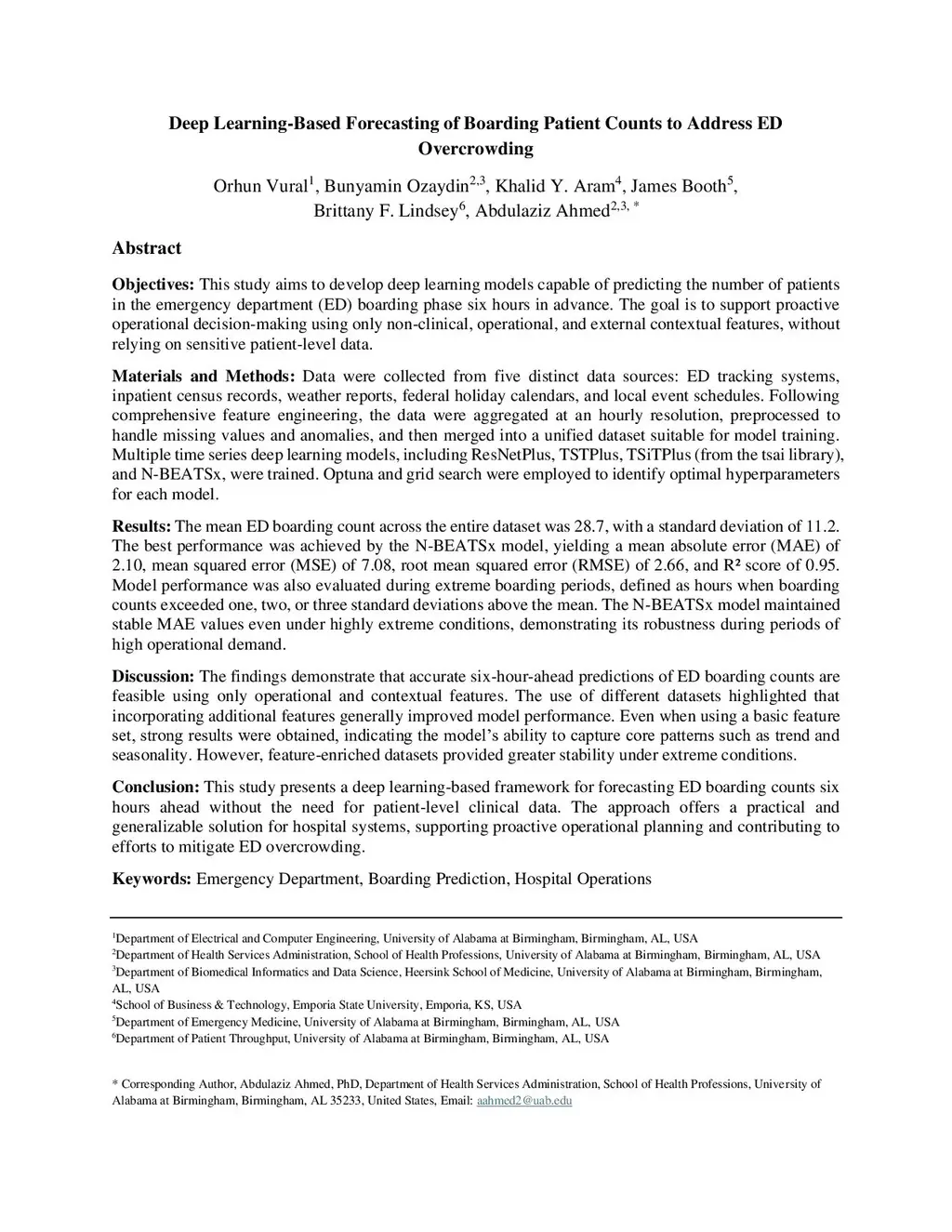 This study presents a deep learning-based framework for predicting emergency department (ED) boarding counts six hours in advance using only operational and contextual data, without patient-level information. Data from ED tracking systems, inpatient census, weather, holidays, and local events were aggregated hourly and processed with comprehensive feature engineering. The mean ED boarding count was 28.7 (standard deviation = 11.2). Multiple deep learning models, including ResNetPlus, TSTPlus, and TSiTPlus, were trained and optimized using Optuna, with TSTPlus achieving the best results (mean absolute error = 4.30, mean squared error = 29.47, R2 = 0.79). The framework accurately forecasted boarding counts, including during extreme periods, and demonstrated that broader input features improve predictive accuracy. This approach supports proactive hospital management and offers a practical method for mitigating ED overcrowding.