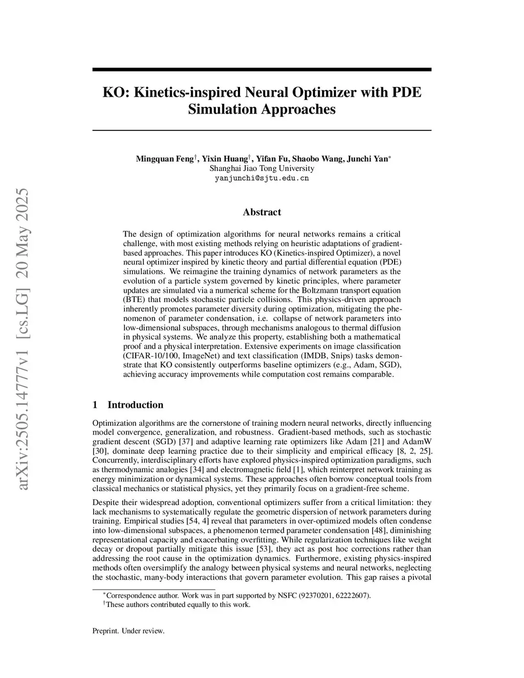 The design of optimization algorithms for neural networks remains a critical challenge, with most existing methods relying on heuristic adaptations of gradient-based approaches. This paper introduces KO (Kinetics-inspired Optimizer), a novel neural optimizer inspired by kinetic theory and partial differential equation (PDE) simulations. We reimagine the training dynamics of network parameters as the evolution of a particle system governed by kinetic principles, where parameter updates are simulated via a numerical scheme for the Boltzmann transport equation (BTE) that models stochastic particle collisions. This physics-driven approach inherently promotes parameter diversity during optimization, mitigating the phenomenon of parameter condensation, i.e. collapse of network parameters into low-dimensional subspaces, through mechanisms analogous to thermal diffusion in physical systems. We analyze this property, establishing both a mathematical proof and a physical interpretation. Extensive experiments on image classification (CIFAR-10/100, ImageNet) and text classification (IMDB, Snips) tasks demonstrate that KO consistently outperforms baseline optimizers (e.g., Adam, SGD), achieving accuracy improvements while computation cost remains comparable.