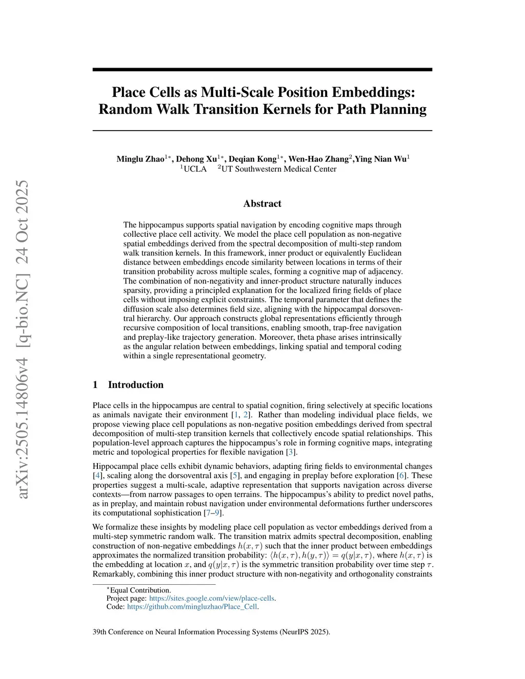 Place Cells as Multi-Scale Position Embeddings: Random Walk Transition Kernels for Path Planning