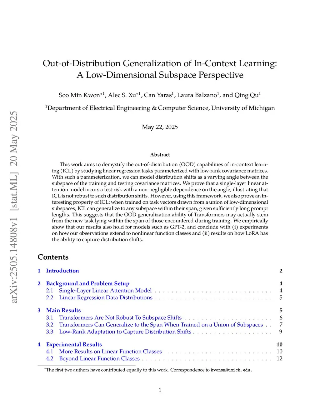 This work aims to demystify the out-of-distribution (OOD) capabilities of in-context learning (ICL) by studying linear regression tasks parameterized with low-rank covariance matrices. With such a parameterization, we can model distribution shifts as a varying angle between the subspace of the training and testing covariance matrices. We prove that a single-layer linear attention model incurs a test risk with a non-negligible dependence on the angle, illustrating that ICL is not robust to such distribution shifts. However, using this framework, we also prove an interesting property of ICL: when trained on task vectors drawn from a union of low-dimensional subspaces, ICL can generalize to any subspace within their span, given sufficiently long prompt lengths. This suggests that the OOD generalization ability of Transformers may actually stem from the new task lying within the span of those encountered during training. We empirically show that our results also hold for models such as GPT-2, and conclude with (i) experiments on how our observations extend to nonlinear function classes and (ii) results on how LoRA has the ability to capture distribution shifts.