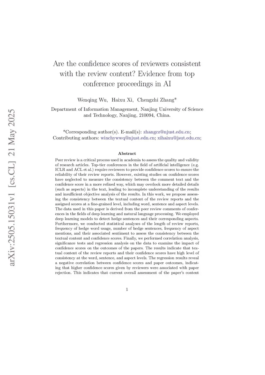 Peer review is vital in academia for evaluating research quality. Top AI conferences use reviewer confidence scores to ensure review reliability, but existing studies lack fine-grained analysis of text-score consistency, potentially missing key details. This work assesses consistency at word, sentence, and aspect levels using deep learning and NLP conference review data. We employ deep learning to detect hedge sentences and aspects, then analyze report length, hedge word/sentence frequency, aspect mentions, and sentiment to evaluate text-score alignment. Correlation, significance, and regression tests examine confidence scores' impact on paper outcomes. Results show high text-score consistency across all levels, with regression revealing higher confidence scores correlate with paper rejection, validating expert assessments and peer review fairness.