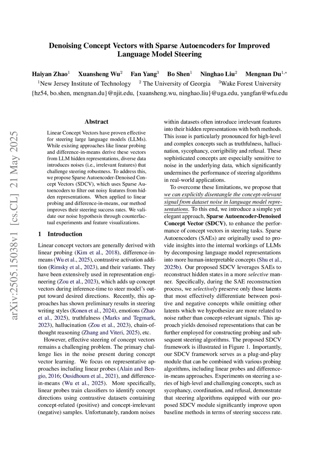 Linear Concept Vectors have proven effective for steering large language models (LLMs). While existing approaches like linear probing and difference-in-means derive these vectors from LLM hidden representations, diverse data introduces noises (i.e., irrelevant features) that challenge steering robustness. To address this, we propose Sparse Autoencoder-Denoised Concept Vectors (SDCV), which uses Sparse Autoencoders to filter out noisy features from hidden representations. When applied to linear probing and difference-in-means, our method improves their steering success rates. We validate our noise hypothesis through counterfactual experiments and feature visualizations.
