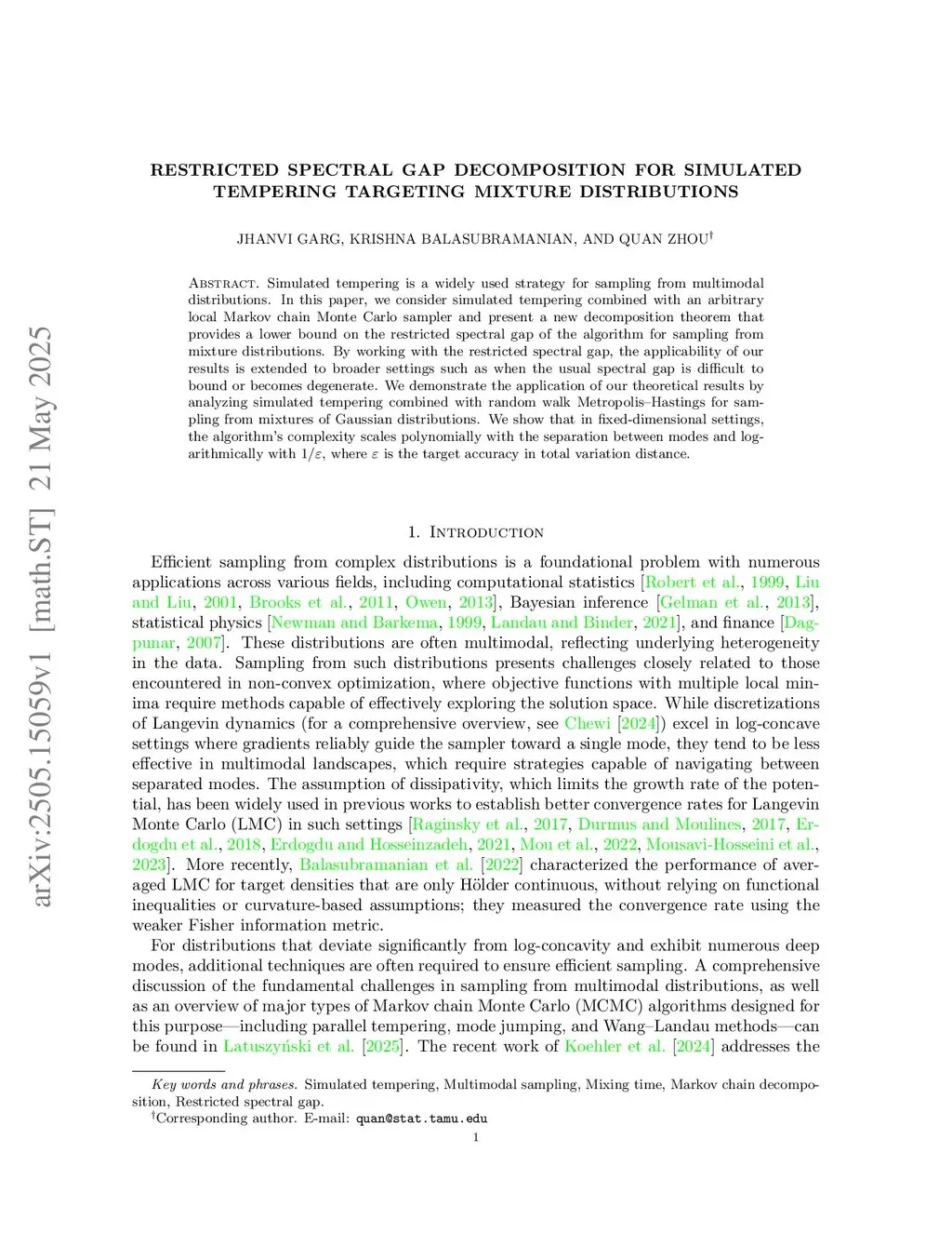 Simulated tempering is a widely used strategy for sampling from multimodal distributions. In this paper, we consider simulated tempering combined with an arbitrary local Markov chain Monte Carlo sampler and present a new decomposition theorem that provides a lower bound on the restricted spectral gap of the algorithm for sampling from mixture distributions. By working with the restricted spectral gap, the applicability of our results is extended to broader settings such as when the usual spectral gap is difficult to bound or becomes degenerate. We demonstrate the application of our theoretical results by analyzing simulated tempering combined with random walk Metropolis--Hastings for sampling from mixtures of Gaussian distributions. Our complexity bound scales polynomially with the separation between modes, logarithmically with , where denotes the target accuracy in total variation distance, and exponentially with the dimension .
