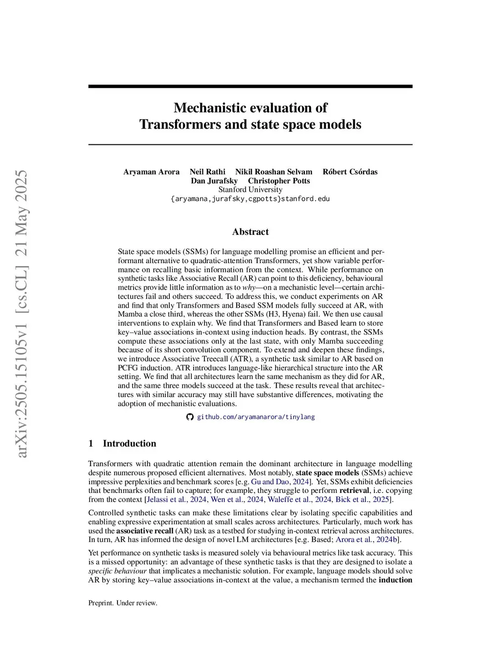 Mechanistic evaluation of Transformers and state space models