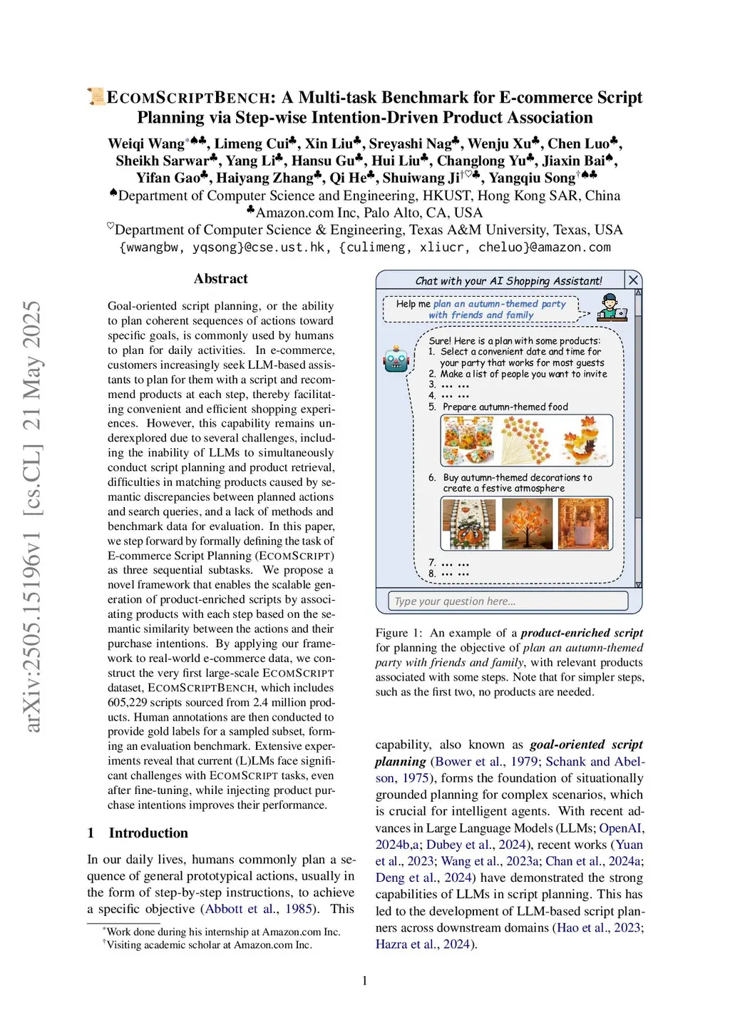 Goal-oriented script planning, or the ability to devise coherent sequences of actions toward specific goals, is commonly employed by humans to plan for typical activities. In e-commerce, customers increasingly seek LLM-based assistants to generate scripts and recommend products at each step, thereby facilitating convenient and efficient shopping experiences. However, this capability remains underexplored due to several challenges, including the inability of LLMs to simultaneously conduct script planning and product retrieval, difficulties in matching products caused by semantic discrepancies between planned actions and search queries, and a lack of methods and benchmark data for evaluation. In this paper, we step forward by formally defining the task of E-commerce Script Planning (EcomScript) as three sequential subtasks. We propose a novel framework that enables the scalable generation of product-enriched scripts by associating products with each step based on the semantic similarity between the actions and their purchase intentions. By applying our framework to real-world e-commerce data, we construct the very first large-scale EcomScript dataset, EcomScriptBench, which includes 605,229 scripts sourced from 2.4 million products. Human annotations are then conducted to provide gold labels for a sampled subset, forming an evaluation benchmark. Extensive experiments reveal that current (L)LMs face significant challenges with EcomScript tasks, even after fine-tuning, while injecting product purchase intentions improves their performance.