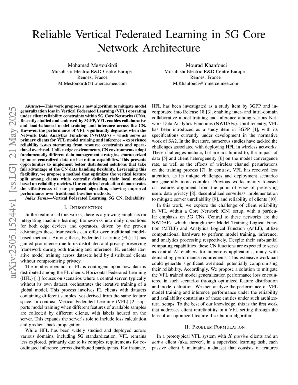 Reliable Vertical Federated Learning in 5G Core Network Architecture