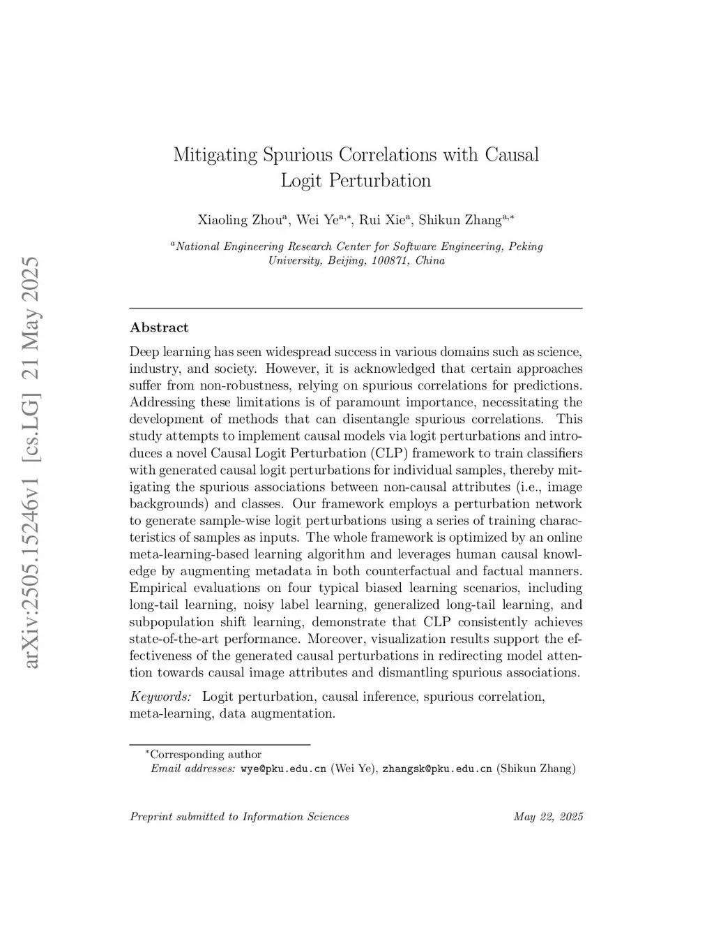 Deep learning has seen widespread success in various domains such as science, industry, and society. However, it is acknowledged that certain approaches suffer from non-robustness, relying on spurious correlations for predictions. Addressing these limitations is of paramount importance, necessitating the development of methods that can disentangle spurious correlations. {This study attempts to implement causal models via logit perturbations and introduces a novel Causal Logit Perturbation (CLP) framework to train classifiers with generated causal logit perturbations for individual samples, thereby mitigating the spurious associations between non-causal attributes (i.e., image backgrounds) and classes.} {Our framework employs a} perturbation network to generate sample-wise logit perturbations using a series of training characteristics of samples as inputs. The whole framework is optimized by an online meta-learning-based learning algorithm and leverages human causal knowledge by augmenting metadata in both counterfactual and factual manners. Empirical evaluations on four typical biased learning scenarios, including long-tail learning, noisy label learning, generalized long-tail learning, and subpopulation shift learning, demonstrate that CLP consistently achieves state-of-the-art performance. Moreover, visualization results support the effectiveness of the generated causal perturbations in redirecting model attention towards causal image attributes and dismantling spurious associations.