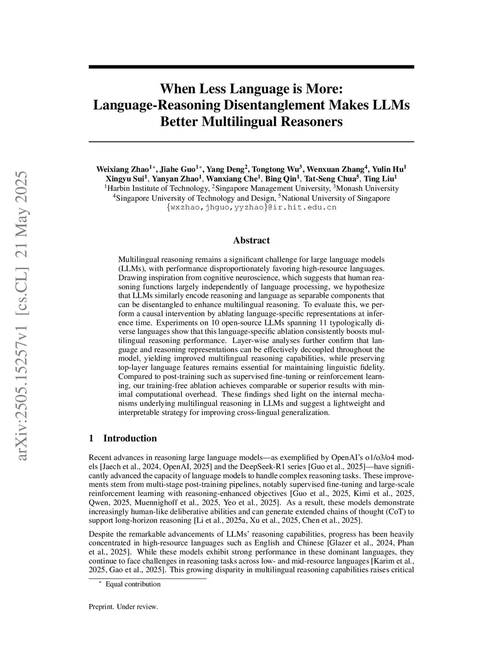 Multilingual reasoning remains a significant challenge for large language models (LLMs), with performance disproportionately favoring high-resource languages. Drawing inspiration from cognitive neuroscience, which suggests that human reasoning functions largely independently of language processing, we hypothesize that LLMs similarly encode reasoning and language as separable components that can be disentangled to enhance multilingual reasoning. To evaluate this, we perform a causal intervention by ablating language-specific representations at inference time. Experiments on 10 open-weight LLMs spanning 11 typologically diverse languages show that this language-specific ablation consistently boosts multilingual reasoning performance. Layer-wise analyses further confirm that language and reasoning representations can be effectively disentangled throughout the model, yielding improved multilingual reasoning capabilities, while preserving top-layer language features remains essential for maintaining linguistic fidelity. Compared to post-training methods such as supervised fine-tuning or reinforcement learning, our training-free language-reasoning disentanglement achieves comparable or superior results with minimal computational overhead. These findings shed light on the internal mechanisms underlying multilingual reasoning in LLMs and suggest a lightweight and interpretable strategy for improving cross-lingual generalization.