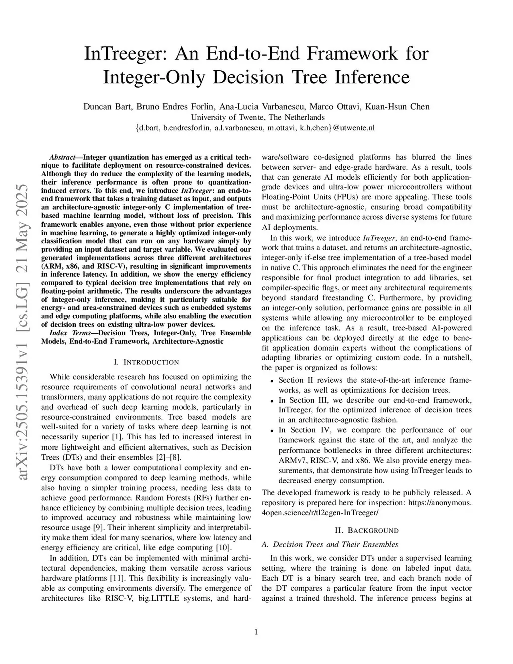Integer quantization has emerged as a critical technique to facilitate deployment on resource-constrained devices. Although they do reduce the complexity of the learning models, their inference performance is often prone to quantization-induced errors. To this end, we introduce InTreeger: an end-to-end framework that takes a training dataset as input, and outputs an architecture-agnostic integer-only C implementation of tree-based machine learning model, without loss of precision. This framework enables anyone, even those without prior experience in machine learning, to generate a highly optimized integer-only classification model that can run on any hardware simply by providing an input dataset and target variable. We evaluated our generated implementations across three different architectures (ARM, x86, and RISC-V), resulting in significant improvements in inference latency. In addition, we show the energy efficiency compared to typical decision tree implementations that rely on floating-point arithmetic. The results underscore the advantages of integer-only inference, making it particularly suitable for energy- and area-constrained devices such as embedded systems and edge computing platforms, while also enabling the execution of decision trees on existing ultra-low power devices.