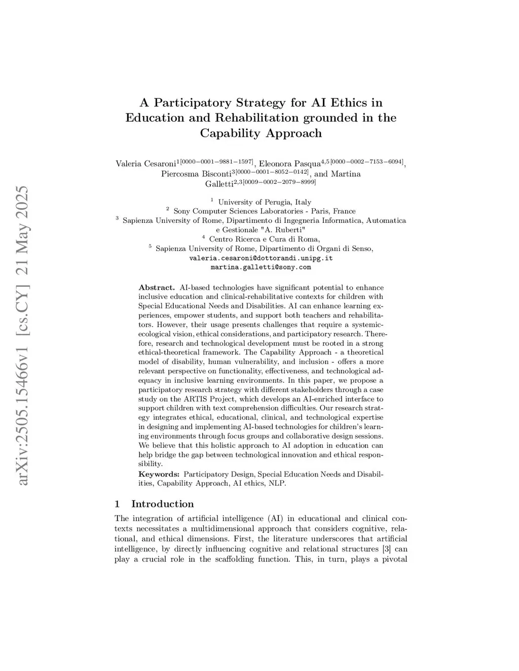 AI-based technologies have significant potential to enhance inclusive education and clinical-rehabilitative contexts for children with Special Educational Needs and Disabilities. AI can enhance learning experiences, empower students, and support both teachers and rehabilitators. However, their usage presents challenges that require a systemic-ecological vision, ethical considerations, and participatory research. Therefore, research and technological development must be rooted in a strong ethical-theoretical framework. The Capability Approach - a theoretical model of disability, human vulnerability, and inclusion - offers a more relevant perspective on functionality, effectiveness, and technological adequacy in inclusive learning environments. In this paper, we propose a participatory research strategy with different stakeholders through a case study on the ARTIS Project, which develops an AI-enriched interface to support children with text comprehension difficulties. Our research strategy integrates ethical, educational, clinical, and technological expertise in designing and implementing AI-based technologies for children's learning environments through focus groups and collaborative design sessions. We believe that this holistic approach to AI adoption in education can help bridge the gap between technological innovation and ethical responsibility.