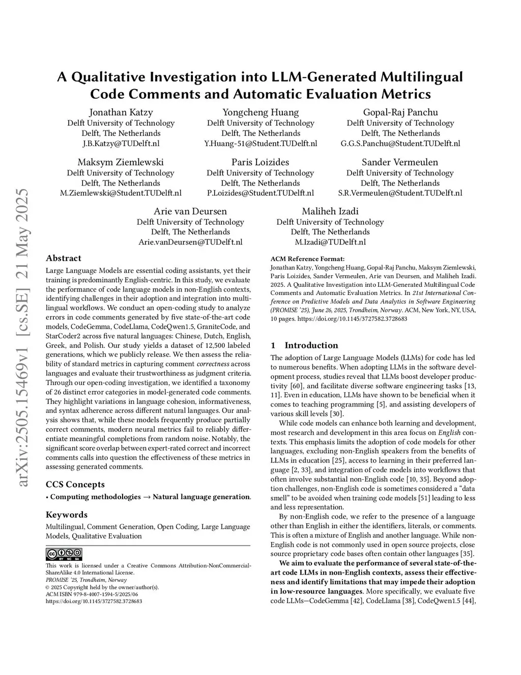 Large Language Models are essential coding assistants, yet their training is predominantly English-centric. In this study, we evaluate the performance of code language models in non-English contexts, identifying challenges in their adoption and integration into multilingual workflows. We conduct an open-coding study to analyze errors in code comments generated by five state-of-the-art code models, CodeGemma, CodeLlama, CodeQwen1.5, GraniteCode, and StarCoder2 across five natural languages: Chinese, Dutch, English, Greek, and Polish. Our study yields a dataset of 12,500 labeled generations, which we publicly release. We then assess the reliability of standard metrics in capturing comment \textit{correctness} across languages and evaluate their trustworthiness as judgment criteria. Through our open-coding investigation, we identified a taxonomy of 26 distinct error categories in model-generated code comments. They highlight variations in language cohesion, informativeness, and syntax adherence across different natural languages. Our analysis shows that, while these models frequently produce partially correct comments, modern neural metrics fail to reliably differentiate meaningful completions from random noise. Notably, the significant score overlap between expert-rated correct and incorrect comments calls into question the effectiveness of these metrics in assessing generated comments.