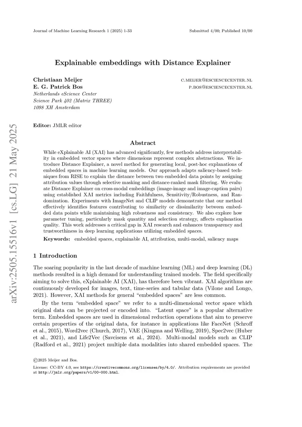 While eXplainable AI (XAI) has advanced significantly, few methods address interpretability in embedded vector spaces where dimensions represent complex abstractions. We introduce Distance Explainer, a novel method for generating local, post-hoc explanations of embedded spaces in machine learning models. Our approach adapts saliency-based techniques from RISE to explain the distance between two embedded data points by assigning attribution values through selective masking and distance-ranked mask filtering. We evaluate Distance Explainer on cross-modal embeddings (image-image and image-caption pairs) using established XAI metrics including Faithfulness, Sensitivity/Robustness, and Randomization. Experiments with ImageNet and CLIP models demonstrate that our method effectively identifies features contributing to similarity or dissimilarity between embedded data points while maintaining high robustness and consistency. We also explore how parameter tuning, particularly mask quantity and selection strategy, affects explanation quality. This work addresses a critical gap in XAI research and enhances transparency and trustworthiness in deep learning applications utilizing embedded spaces.