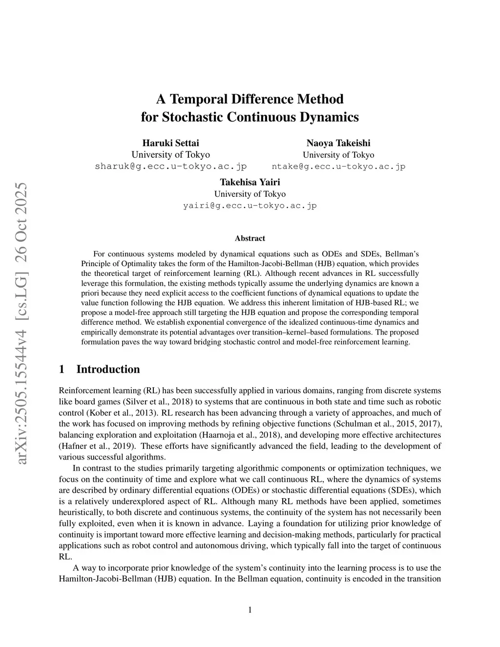 A Temporal Difference Method for Stochastic Continuous Dynamics