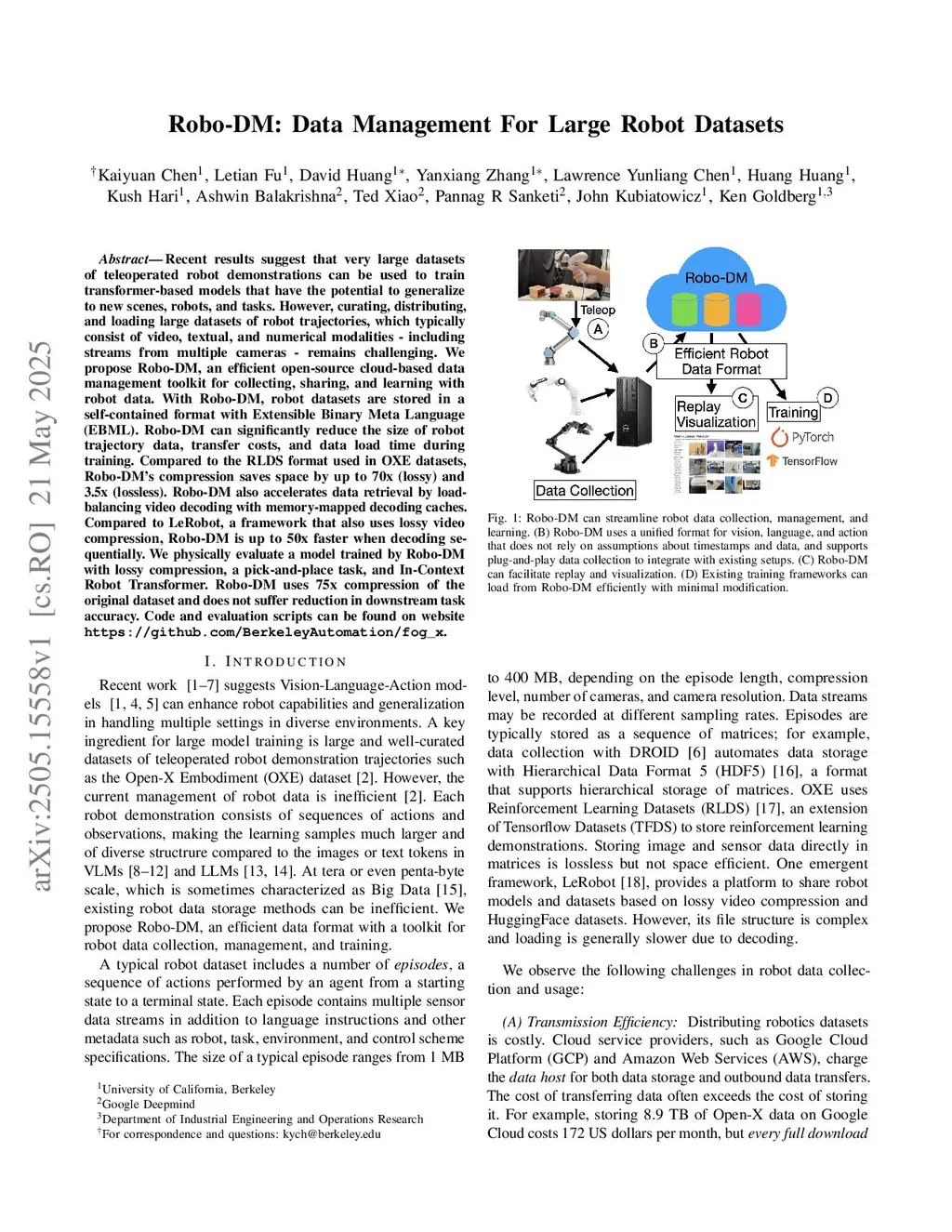 Recent results suggest that very large datasets of teleoperated robot demonstrations can be used to train transformer-based models that have the potential to generalize to new scenes, robots, and tasks. However, curating, distributing, and loading large datasets of robot trajectories, which typically consist of video, textual, and numerical modalities - including streams from multiple cameras - remains challenging. We propose Robo-DM, an efficient open-source cloud-based data management toolkit for collecting, sharing, and learning with robot data. With Robo-DM, robot datasets are stored in a self-contained format with Extensible Binary Meta Language (EBML). Robo-DM can significantly reduce the size of robot trajectory data, transfer costs, and data load time during training. Compared to the RLDS format used in OXE datasets, Robo-DM's compression saves space by up to 70x (lossy) and 3.5x (lossless). Robo-DM also accelerates data retrieval by load-balancing video decoding with memory-mapped decoding caches. Compared to LeRobot, a framework that also uses lossy video compression, Robo-DM is up to 50x faster when decoding sequentially. We physically evaluate a model trained by Robo-DM with lossy compression, a pick-and-place task, and In-Context Robot Transformer. Robo-DM uses 75x compression of the original dataset and does not suffer reduction in downstream task accuracy.