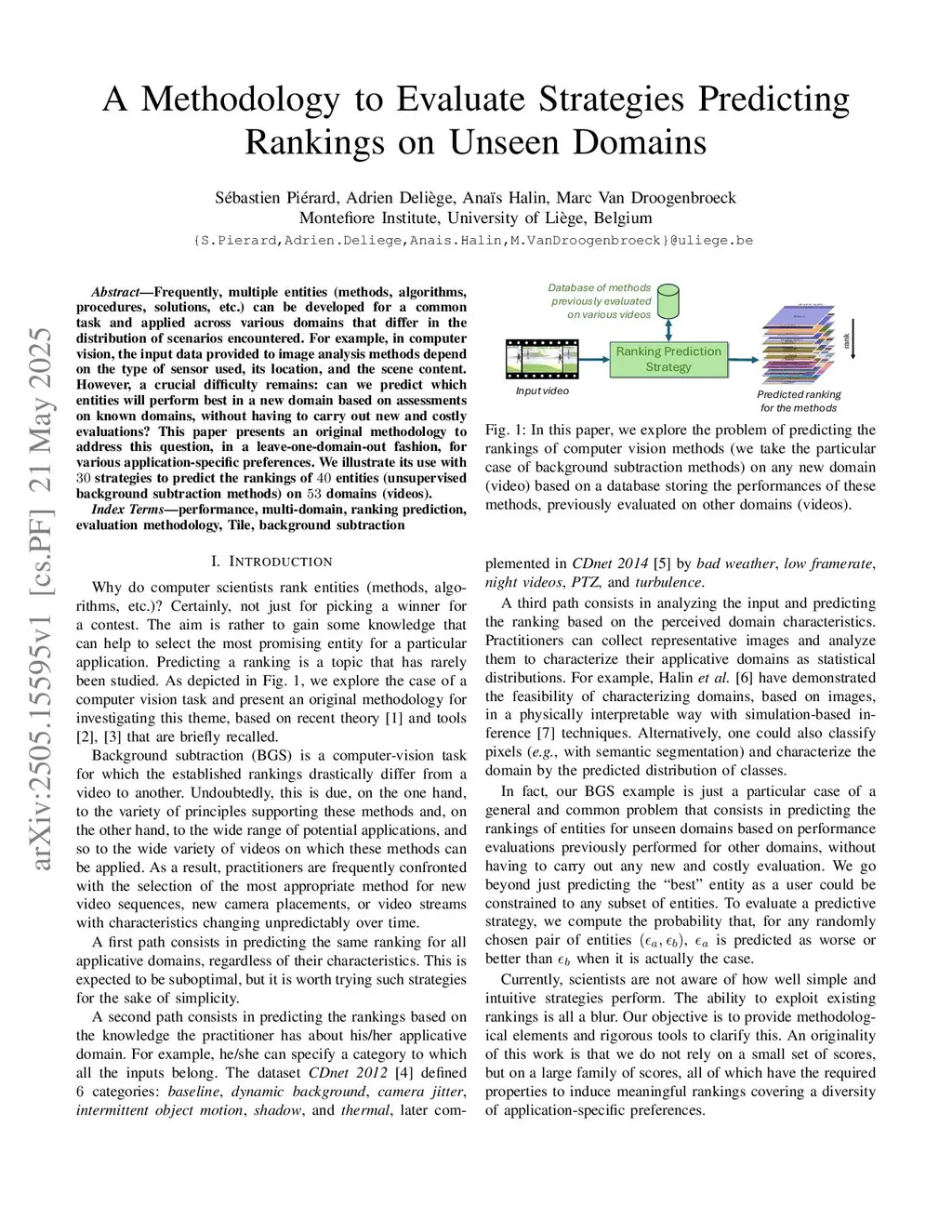Frequently, multiple entities (methods, algorithms, procedures, solutions, etc.) can be developed for a common task and applied across various domains that differ in the distribution of scenarios encountered. For example, in computer vision, the input data provided to image analysis methods depend on the type of sensor used, its location, and the scene content. However, a crucial difficulty remains: can we predict which entities will perform best in a new domain based on assessments on known domains, without having to carry out new and costly evaluations? This paper presents an original methodology to address this question, in a leave-one-domain-out fashion, for various application-specific preferences. We illustrate its use with 30 strategies to predict the rankings of 40 entities (unsupervised background subtraction methods) on 53 domains (videos).