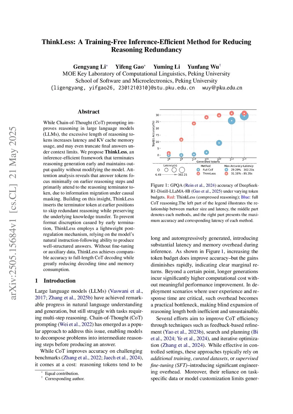While Chain-of-Thought (CoT) prompting improves reasoning in large language models (LLMs), the excessive length of reasoning tokens increases latency and KV cache memory usage, and may even truncate final answers under context limits. We propose ThinkLess, an inference-efficient framework that terminates reasoning generation early and maintains output quality without modifying the model. Atttention analysis reveals that answer tokens focus minimally on earlier reasoning steps and primarily attend to the reasoning terminator token, due to information migration under causal masking. Building on this insight, ThinkLess inserts the terminator token at earlier positions to skip redundant reasoning while preserving the underlying knowledge transfer. To prevent format discruption casued by early termination, ThinkLess employs a lightweight post-regulation mechanism, relying on the model's natural instruction-following ability to produce well-structured answers. Without fine-tuning or auxiliary data, ThinkLess achieves comparable accuracy to full-length CoT decoding while greatly reducing decoding time and memory consumption.