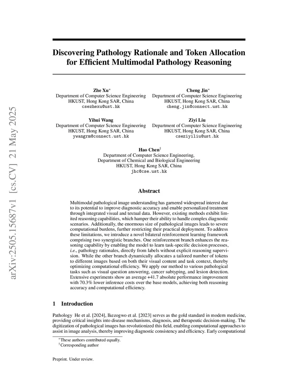 Multimodal pathological image understanding has garnered widespread interest due to its potential to improve diagnostic accuracy and enable personalized treatment through integrated visual and textual data. However, existing methods exhibit limited reasoning capabilities, which hamper their ability to handle complex diagnostic scenarios. Additionally, the enormous size of pathological images leads to severe computational burdens, further restricting their practical deployment. To address these limitations, we introduce a novel bilateral reinforcement learning framework comprising two synergistic branches. One reinforcement branch enhances the reasoning capability by enabling the model to learn task-specific decision processes, i.e., pathology rationales, directly from labels without explicit reasoning supervision. While the other branch dynamically allocates a tailored number of tokens to different images based on both their visual content and task context, thereby optimizing computational efficiency. We apply our method to various pathological tasks such as visual question answering, cancer subtyping, and lesion detection. Extensive experiments show an average +41.7 absolute performance improvement with 70.3% lower inference costs over the base models, achieving both reasoning accuracy and computational efficiency.