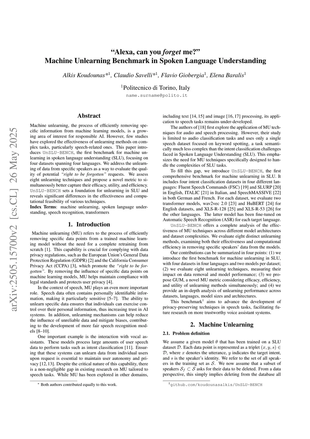 "Alexa, can you forget me?" Machine Unlearning Benchmark in Spoken Language Understanding
