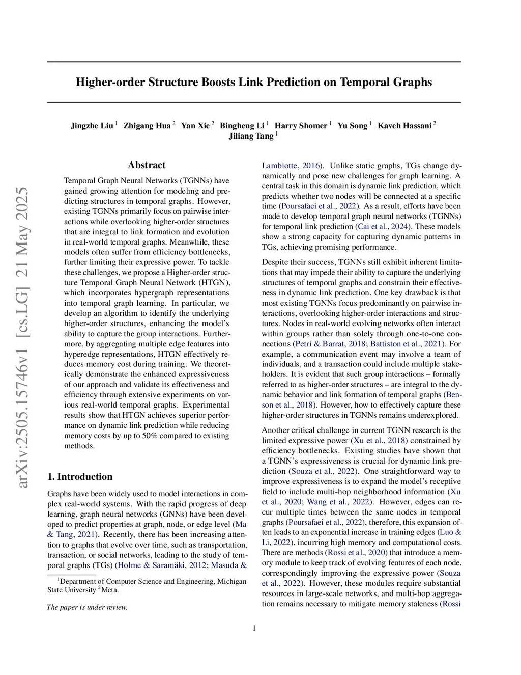 Temporal Graph Neural Networks (TGNNs) have gained growing attention for modeling and predicting structures in temporal graphs. However, existing TGNNs primarily focus on pairwise interactions while overlooking higher-order structures that are integral to link formation and evolution in real-world temporal graphs. Meanwhile, these models often suffer from efficiency bottlenecks, further limiting their expressive power. To tackle these challenges, we propose a Higher-order structure Temporal Graph Neural Network, which incorporates hypergraph representations into temporal graph learning. In particular, we develop an algorithm to identify the underlying higher-order structures, enhancing the model's ability to capture the group interactions. Furthermore, by aggregating multiple edge features into hyperedge representations, HTGN effectively reduces memory cost during training. We theoretically demonstrate the enhanced expressiveness of our approach and validate its effectiveness and efficiency through extensive experiments on various real-world temporal graphs. Experimental results show that HTGN achieves superior performance on dynamic link prediction while reducing memory costs by up to 50\% compared to existing methods.