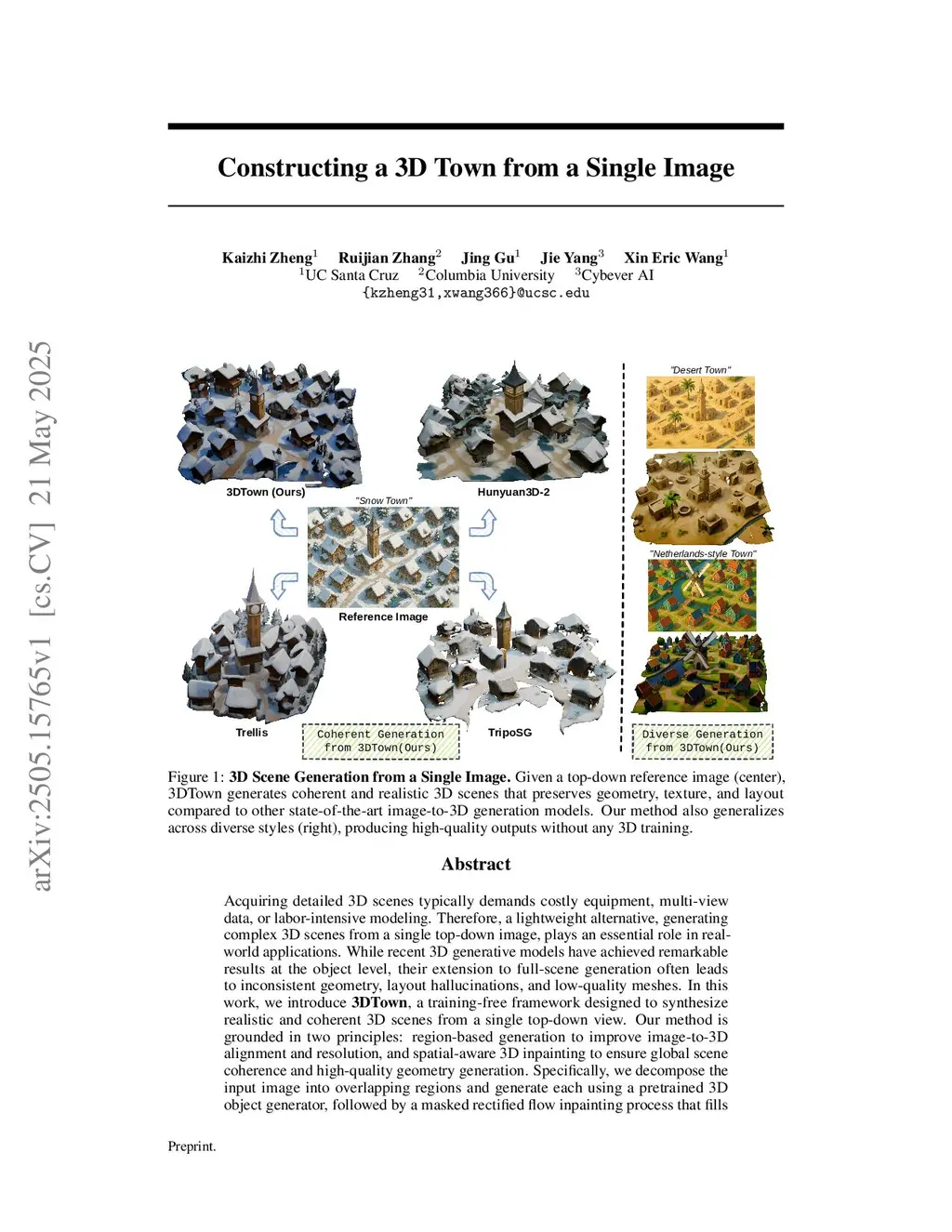 Acquiring detailed 3D scenes typically demands costly equipment, multi-view data, or labor-intensive modeling. Therefore, a lightweight alternative, generating complex 3D scenes from a single top-down image, plays an essential role in real-world applications. While recent 3D generative models have achieved remarkable results at the object level, their extension to full-scene generation often leads to inconsistent geometry, layout hallucinations, and low-quality meshes. In this work, we introduce SceneFuse-3D, a training-free framework designed to synthesize coherent 3D scenes from a single top-down view. Our method is grounded in two principles: region-based generation to improve image-to-3D alignment and resolution, and spatial-aware 3D inpainting to ensure global scene coherence and high-quality geometry generation. Specifically, we decompose the input image into overlapping regions and generate each using a pretrained 3D object generator, followed by a masked rectified flow inpainting process that fills in missing geometry while maintaining structural continuity. This modular design allows us to overcome resolution bottlenecks and preserve spatial structure without requiring 3D supervision or fine-tuning. Extensive experiments across diverse scenes show that SceneFuse-3D outperforms state-of-the-art baselines, including Trellis, Hunyuan3D-2, TripoSG, and LGM, in terms of geometry quality, spatial coherence, and texture fidelity. Our results demonstrate that high-quality coherent 3D scene-level asset generation is achievable from a single top-down image using a principled, training-free pipeline.