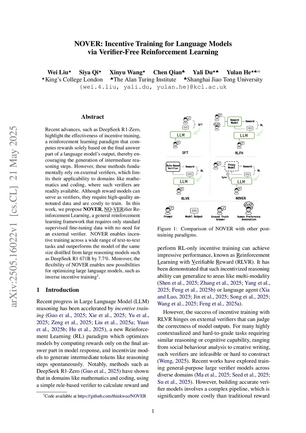 Recent advances such as DeepSeek R1-Zero highlight the effectiveness of incentive training, a reinforcement learning paradigm that computes rewards solely based on the final answer part of a language model's output, thereby encouraging the generation of intermediate reasoning steps. However, these methods fundamentally rely on external verifiers, which limits their applicability to domains like mathematics and coding where such verifiers are readily available. Although reward models can serve as verifiers, they require high-quality annotated data and are costly to train. In this work, we propose NOVER, NO-VERifier Reinforcement Learning, a general reinforcement learning framework that requires only standard supervised fine-tuning data with no need for an external verifier. NOVER enables incentive training across a wide range of text-to-text tasks and outperforms the model of the same size distilled from large reasoning models such as DeepSeek R1 671B by 7.7 percent. Moreover, the flexibility of NOVER enables new possibilities for optimizing large language models, such as inverse incentive training.