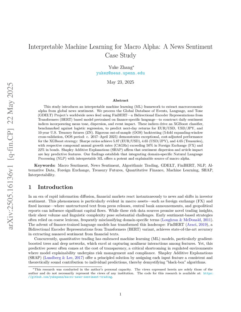 This study introduces an interpretable machine learning (ML) framework to extract macroeconomic alpha from global news sentiment. We process the Global Database of Events, Language, and Tone (GDELT) Project's worldwide news feed using FinBERT -- a Bidirectional Encoder Representations from Transformers (BERT) based model pretrained on finance-specific language -- to construct daily sentiment indices incorporating mean tone, dispersion, and event impact. These indices drive an XGBoost classifier, benchmarked against logistic regression, to predict next-day returns for EUR/USD, USD/JPY, and 10-year U.S. Treasury futures (ZN). Rigorous out-of-sample (OOS) backtesting (5-fold expanding-window cross-validation, OOS period: c. 2017-April 2025) demonstrates exceptional, cost-adjusted performance for the XGBoost strategy: Sharpe ratios achieve 5.87 (EUR/USD), 4.65 (USD/JPY), and 4.65 (Treasuries), with respective compound annual growth rates (CAGRs) exceeding 50% in Foreign Exchange (FX) and 22% in bonds. Shapley Additive Explanations (SHAP) affirm that sentiment dispersion and article impact are key predictive features. Our findings establish that integrating domain-specific Natural Language Processing (NLP) with interpretable ML offers a potent and explainable source of macro alpha.