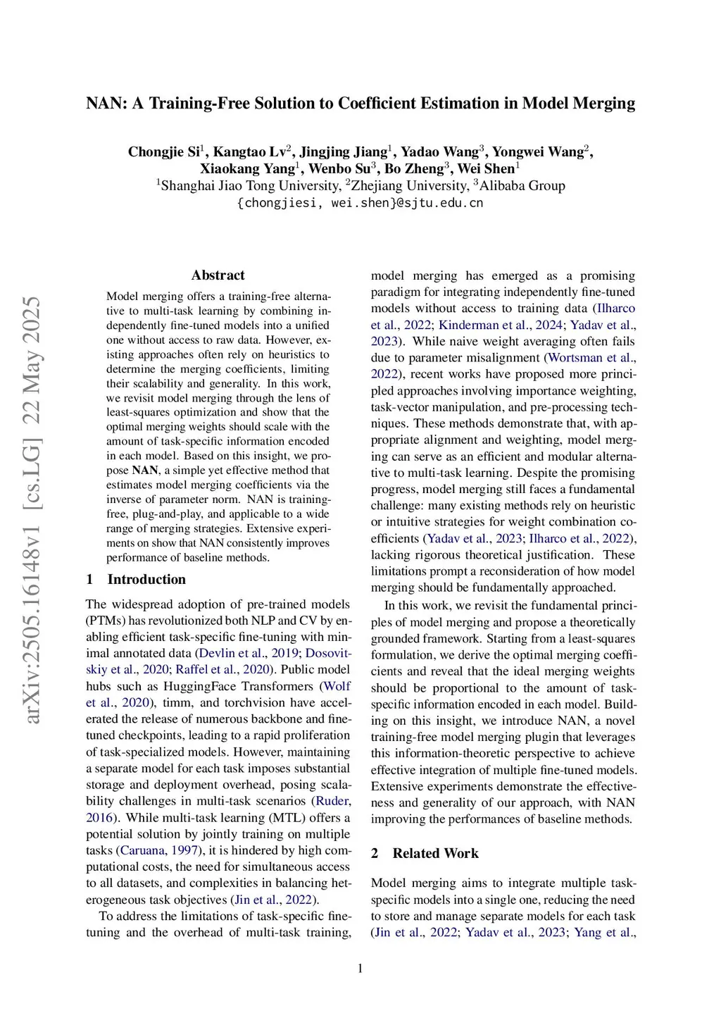 Model merging offers a training-free alternative to multi-task learning by combining independently fine-tuned models into a unified one without access to raw data. However, existing approaches often rely on heuristics to determine the merging coefficients, limiting their scalability and generality. In this work, we revisit model merging through the lens of least-squares optimization and show that the optimal merging weights should scale with the amount of task-specific information encoded in each model. Based on this insight, we propose NAN, a simple yet effective method that estimates model merging coefficients via the inverse of parameter norm. NAN is training-free, plug-and-play, and applicable to a wide range of merging strategies. Extensive experiments on show that NAN consistently improves performance of baseline methods.