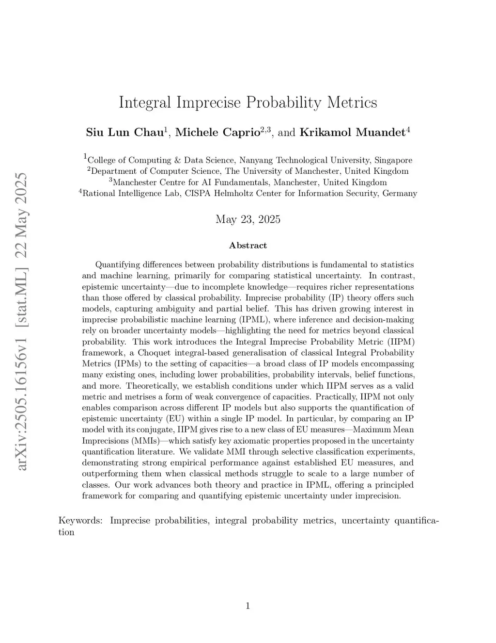 Quantifying differences between probability distributions is fundamental to statistics and machine learning, primarily for comparing statistical uncertainty. In contrast, epistemic uncertainty (EU) -- due to incomplete knowledge -- requires richer representations than those offered by classical probability. Imprecise probability (IP) theory offers such models, capturing ambiguity and partial belief. This has driven growing interest in imprecise probabilistic machine learning (IPML), where inference and decision-making rely on broader uncertainty models -- highlighting the need for metrics beyond classical probability. This work introduces the Integral Imprecise Probability Metric (IIPM) framework, a Choquet integral-based generalisation of classical Integral Probability Metric (IPM) to the setting of capacities -- a broad class of IP models encompassing many existing ones, including lower probabilities, probability intervals, belief functions, and more. Theoretically, we establish conditions under which IIPM serves as a valid metric and metrises a form of weak convergence of capacities. Practically, IIPM not only enables comparison across different IP models but also supports the quantification of epistemic uncertainty within a single IP model. In particular, by comparing an IP model with its conjugate, IIPM gives rise to a new class of EU measures -- Maximum Mean Imprecision -- which satisfy key axiomatic properties proposed in the Uncertainty Quantification literature. We validate MMI through selective classification experiments, demonstrating strong empirical performance against established EU measures, and outperforming them when classical methods struggle to scale to a large number of classes. Our work advances both theory and practice in IPML, offering a principled framework for comparing and quantifying epistemic uncertainty under imprecision.