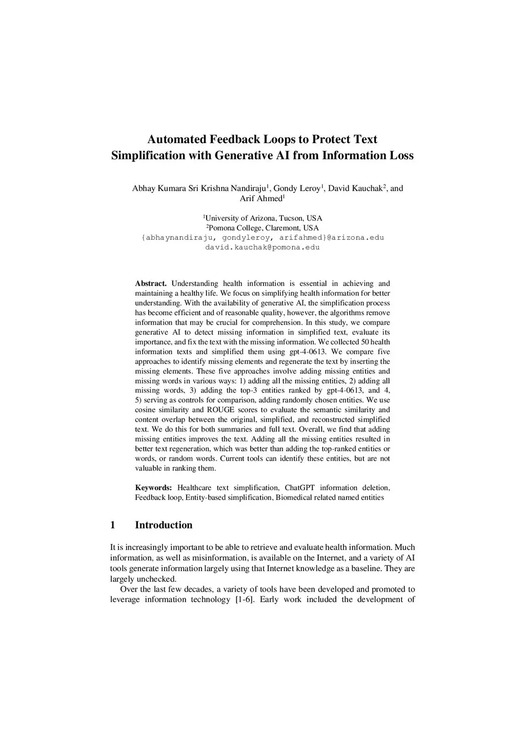 Understanding health information is essential in achieving and maintaining a healthy life. We focus on simplifying health information for better understanding. With the availability of generative AI, the simplification process has become efficient and of reasonable quality, however, the algorithms remove information that may be crucial for comprehension. In this study, we compare generative AI to detect missing information in simplified text, evaluate its importance, and fix the text with the missing information. We collected 50 health information texts and simplified them using gpt-4-0613. We compare five approaches to identify missing elements and regenerate the text by inserting the missing elements. These five approaches involve adding missing entities and missing words in various ways: 1) adding all the missing entities, 2) adding all missing words, 3) adding the top-3 entities ranked by gpt-4-0613, and 4, 5) serving as controls for comparison, adding randomly chosen entities. We use cosine similarity and ROUGE scores to evaluate the semantic similarity and content overlap between the original, simplified, and reconstructed simplified text. We do this for both summaries and full text. Overall, we find that adding missing entities improves the text. Adding all the missing entities resulted in better text regeneration, which was better than adding the top-ranked entities or words, or random words. Current tools can identify these entities, but are not valuable in ranking them.