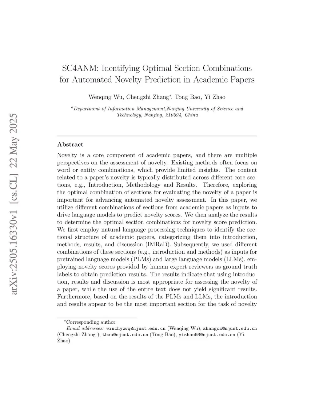 SC4ANM: Identifying Optimal Section Combinations for Automated Novelty Prediction in Academic Papers