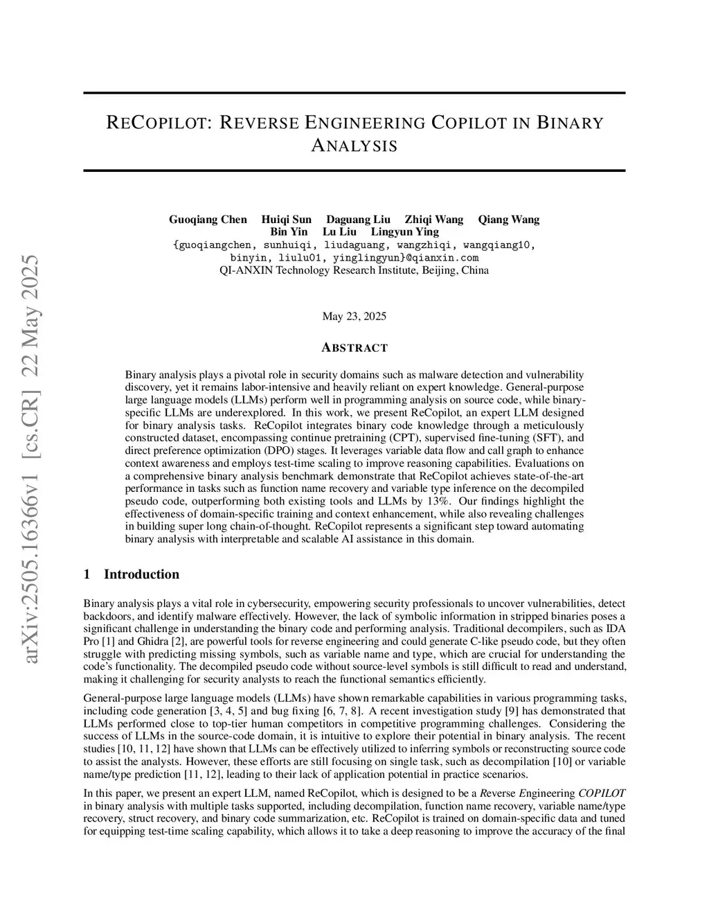 Binary analysis plays a pivotal role in security domains such as malware detection and vulnerability discovery, yet it remains labor-intensive and heavily reliant on expert knowledge. General-purpose large language models (LLMs) perform well in programming analysis on source code, while binaryspecific LLMs are underexplored. In this work, we present ReCopilot, an expert LLM designed for binary analysis tasks. ReCopilot integrates binary code knowledge through a meticulously constructed dataset, encompassing continue pretraining (CPT), supervised fine-tuning (SFT), and direct preference optimization (DPO) stages. It leverages variable data flow and call graph to enhance context awareness and employs test-time scaling to improve reasoning capabilities. Evaluations on a comprehensive binary analysis benchmark demonstrate that ReCopilot achieves state-of-the-art performance in tasks such as function name recovery and variable type inference on the decompiled pseudo code, outperforming both existing tools and LLMs by 13%. Our findings highlight the effectiveness of domain-specific training and context enhancement, while also revealing challenges in building super long chain-of-thought. ReCopilot represents a significant step toward automating binary analysis with interpretable and scalable AI assistance in this domain.