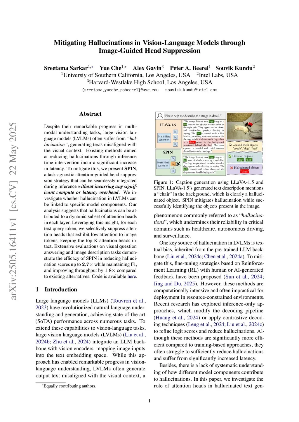 Despite their remarkable progress in multimodal understanding tasks, large vision language models (LVLMs) often suffer from "hallucinations", generating texts misaligned with the visual context. Existing methods aimed at reducing hallucinations through inference time intervention incur a significant increase in latency. To mitigate this, we present SPIN, a task-agnostic attention-guided head suppression strategy that can be seamlessly integrated during inference, without incurring any significant compute or latency overhead. We investigate whether hallucination in LVLMs can be linked to specific model components. Our analysis suggests that hallucinations can be attributed to a dynamic subset of attention heads in each layer. Leveraging this insight, for each text query token, we selectively suppress attention heads that exhibit low attention to image tokens, keeping the top-K attention heads intact. Extensive evaluations on visual question answering and image description tasks demonstrate the efficacy of SPIN in reducing hallucination scores up to 2.7x while maintaining F1, and improving throughput by 1.8x compared to existing alternatives. Code is available atthis https URL.