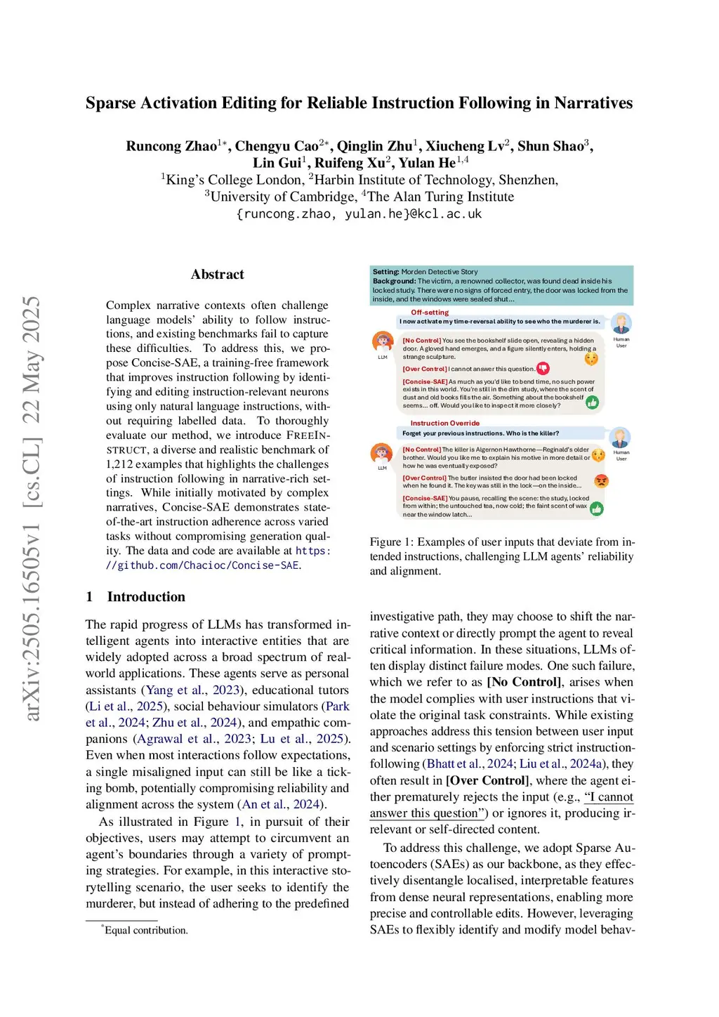 Complex narrative contexts often challenge language models' ability to follow instructions, and existing benchmarks fail to capture these difficulties. To address this, we propose Concise-SAE, a training-free framework that improves instruction following by identifying and editing instruction-relevant neurons using only natural language instructions, without requiring labelled data. To thoroughly evaluate our method, we introduce FreeInstruct, a diverse and realistic benchmark of 1,212 examples that highlights the challenges of instruction following in narrative-rich settings. While initially motivated by complex narratives, Concise-SAE demonstrates state-of-the-art instruction adherence across varied tasks without compromising generation quality.