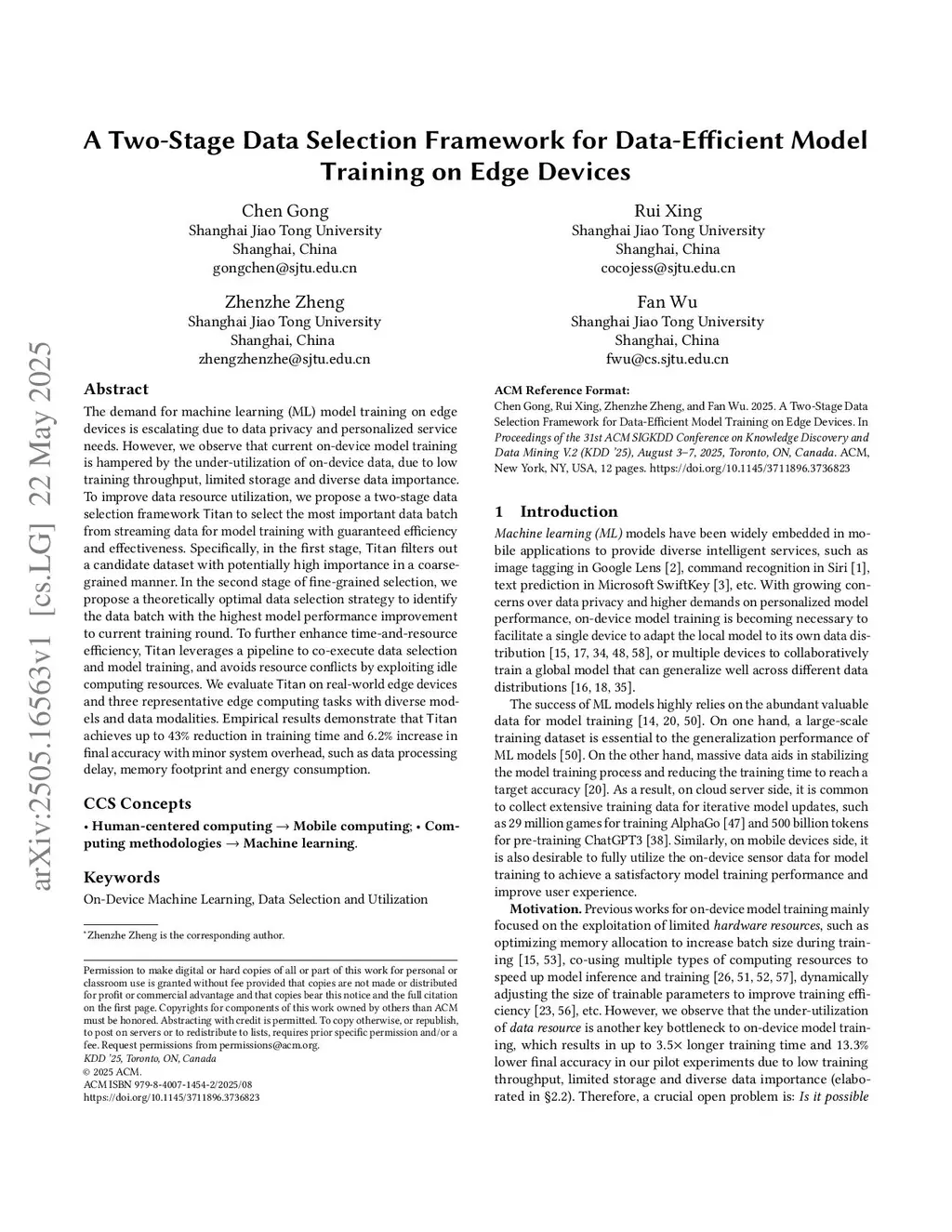 The demand for machine learning (ML) model training on edge devices is escalating due to data privacy and personalized service needs. However, we observe that current on-device model training is hampered by the under-utilization of on-device data, due to low training throughput, limited storage and diverse data importance. To improve data resource utilization, we propose a two-stage data selection framework {\sf Titan} to select the most important data batch from streaming data for model training with guaranteed efficiency and effectiveness. Specifically, in the first stage, {\sf Titan} filters out a candidate dataset with potentially high importance in a coarse-grained this http URL the second stage of fine-grained selection, we propose a theoretically optimal data selection strategy to identify the data batch with the highest model performance improvement to current training round. To further enhance time-and-resource efficiency, {\sf Titan} leverages a pipeline to co-execute data selection and model training, and avoids resource conflicts by exploiting idle computing resources. We evaluate {\sf Titan} on real-world edge devices and three representative edge computing tasks with diverse models and data modalities. Empirical results demonstrate that {\sf Titan} achieves up to reduction in training time and increase in final accuracy with minor system overhead, such as data processing delay, memory footprint and energy consumption.
