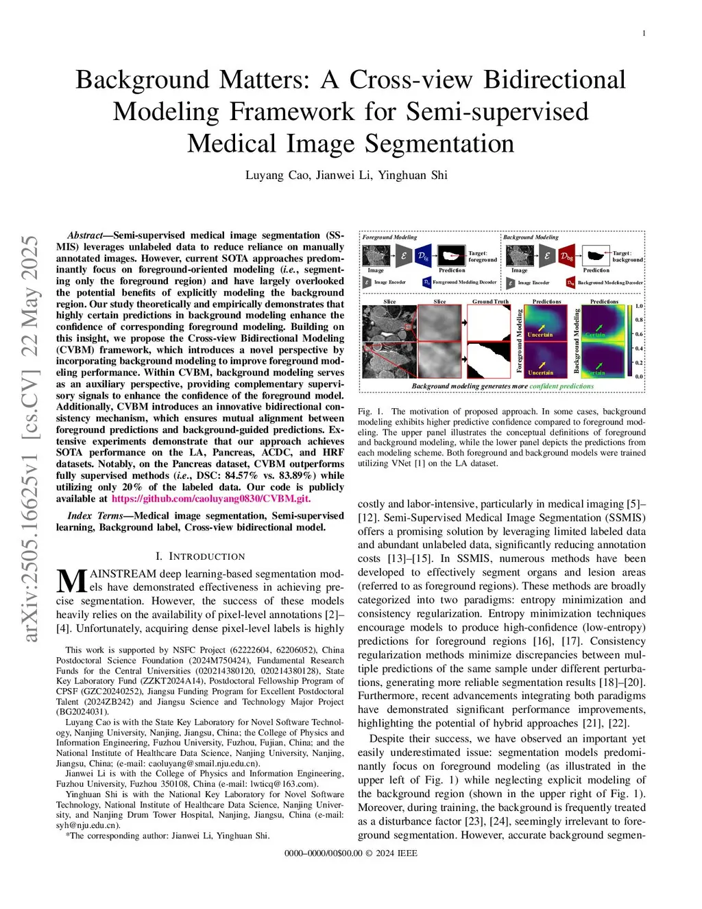 Semi-supervised medical image segmentation (SSMIS) leverages unlabeled data to reduce reliance on manually annotated images. However, current SOTA approaches predominantly focus on foreground-oriented modeling (i.e., segmenting only the foreground region) and have largely overlooked the potential benefits of explicitly modeling the background region. Our study theoretically and empirically demonstrates that highly certain predictions in background modeling enhance the confidence of corresponding foreground modeling. Building on this insight, we propose the Cross-view Bidirectional Modeling (CVBM) framework, which introduces a novel perspective by incorporating background modeling to improve foreground modeling performance. Within CVBM, background modeling serves as an auxiliary perspective, providing complementary supervisory signals to enhance the confidence of the foreground model. Additionally, CVBM introduces an innovative bidirectional consistency mechanism, which ensures mutual alignment between foreground predictions and background-guided predictions. Extensive experiments demonstrate that our approach achieves SOTA performance on the LA, Pancreas, ACDC, and HRF datasets. Notably, on the Pancreas dataset, CVBM outperforms fully supervised methods (i.e., DSC: 84.57% vs. 83.89%) while utilizing only 20% of the labeled data. Our code is publicly available atthis https URL.