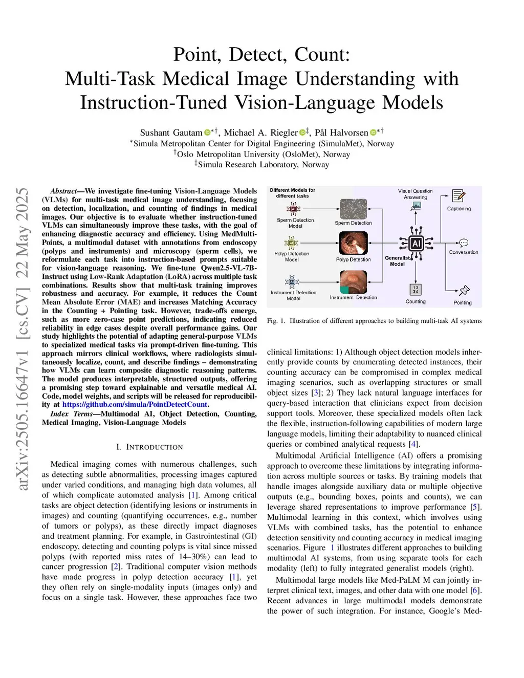 We investigate fine-tuning Vision-Language Models (VLMs) for multi-task medical image understanding, focusing on detection, localization, and counting of findings in medical images. Our objective is to evaluate whether instruction-tuned VLMs can simultaneously improve these tasks, with the goal of enhancing diagnostic accuracy and efficiency. Using MedMultiPoints, a multimodal dataset with annotations from endoscopy (polyps and instruments) and microscopy (sperm cells), we reformulate each task into instruction-based prompts suitable for vision-language reasoning. We fine-tune Qwen2.5-VL-7B-Instruct using Low-Rank Adaptation (LoRA) across multiple task combinations. Results show that multi-task training improves robustness and accuracy. For example, it reduces the Count Mean Absolute Error (MAE) and increases Matching Accuracy in the Counting + Pointing task. However, trade-offs emerge, such as more zero-case point predictions, indicating reduced reliability in edge cases despite overall performance gains. Our study highlights the potential of adapting general-purpose VLMs to specialized medical tasks via prompt-driven fine-tuning. This approach mirrors clinical workflows, where radiologists simultaneously localize, count, and describe findings - demonstrating how VLMs can learn composite diagnostic reasoning patterns. The model produces interpretable, structured outputs, offering a promising step toward explainable and versatile medical AI. Code, model weights, and scripts will be released for reproducibility atthis https URL.
